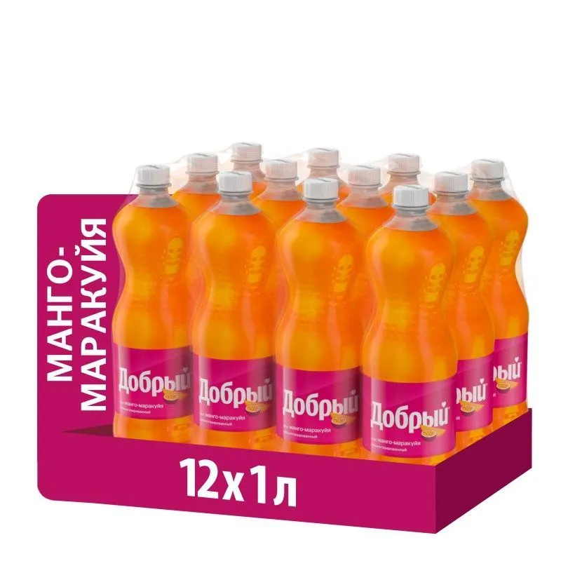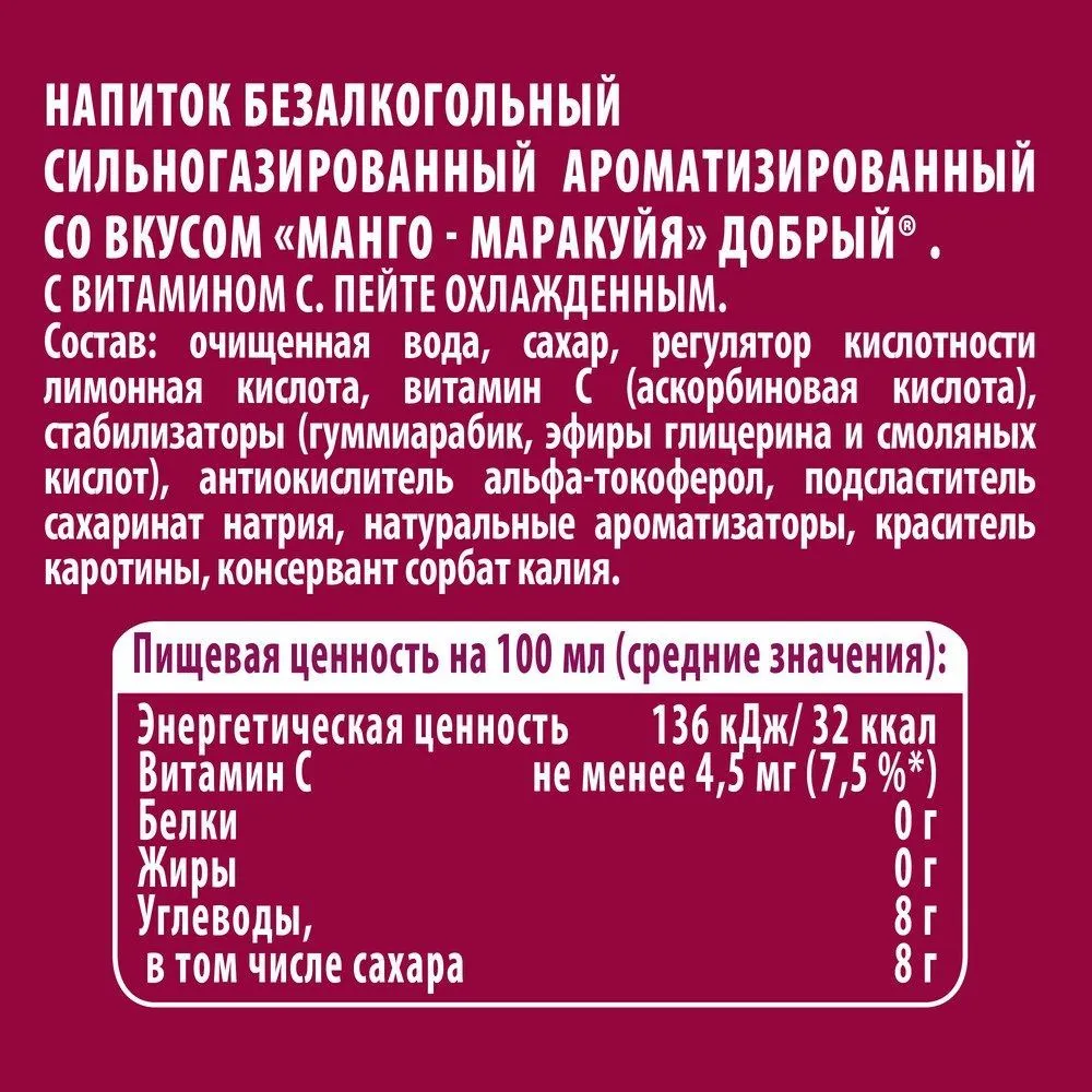 Сильногазированный напиток Добрый со вкусом Манго-маракуйя это необычное сочетание яркого вкуса экзотического манго и множества пузырьков.