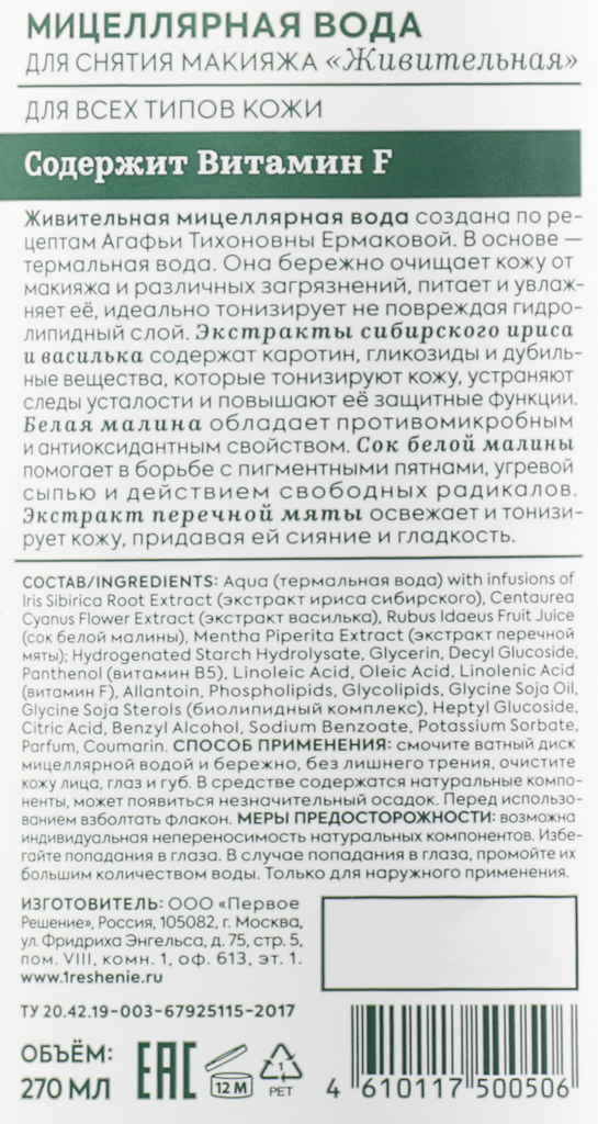 Живительная мицеллярная вода создана по рецептам Агафьи Тихоновны Ермаковой. В основе термальная вода. Она бережно очищает кожу от макияжа и различных загрязнений, питает и увлажняет её, идеально тонизирует не повреждая гидролипидный слой.