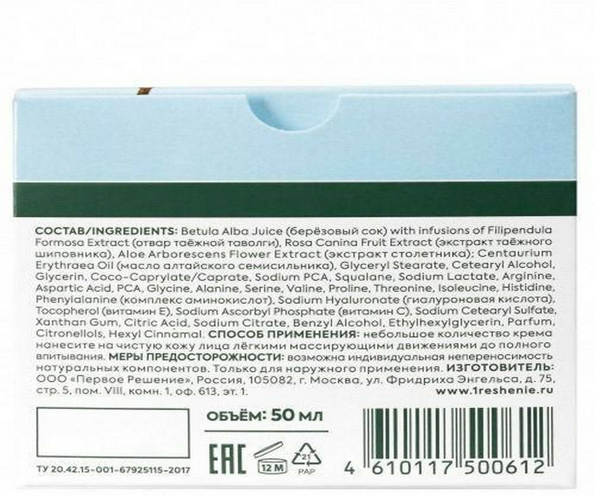| Состав | betula alba juice (березовый сок) with infusions of filipendula formosa extract (отвар таёжной таволги); rosa canina fruit extract (экстракт таёжного шиповника); aloe arborescens flower extract (экстракт столетника); centaurium erythraea oil (масло алтайского семисильника); glyceryl stearate; cetearyl alcohol; glycerin; coco-caprylate/caprate; sodium pca; squalane; sodium lactate; arginine; aspartic acid; pca; glycine; alanine; serine; valine; proline; threonine; isoleucine; histidine; phenylalanine (комплекс аминокислот); sodium hyaluronate (гиалуроновая кислота); tocopherol (витамин е); sodium ascorbyl phosphate (витамин с); sodium cetearyl sulfate; xanthan gum; citric acid; sodium citrate; benzyl alcohol; ethylhexylglycerin; parfum; citronellols; hexyl cinnamal |