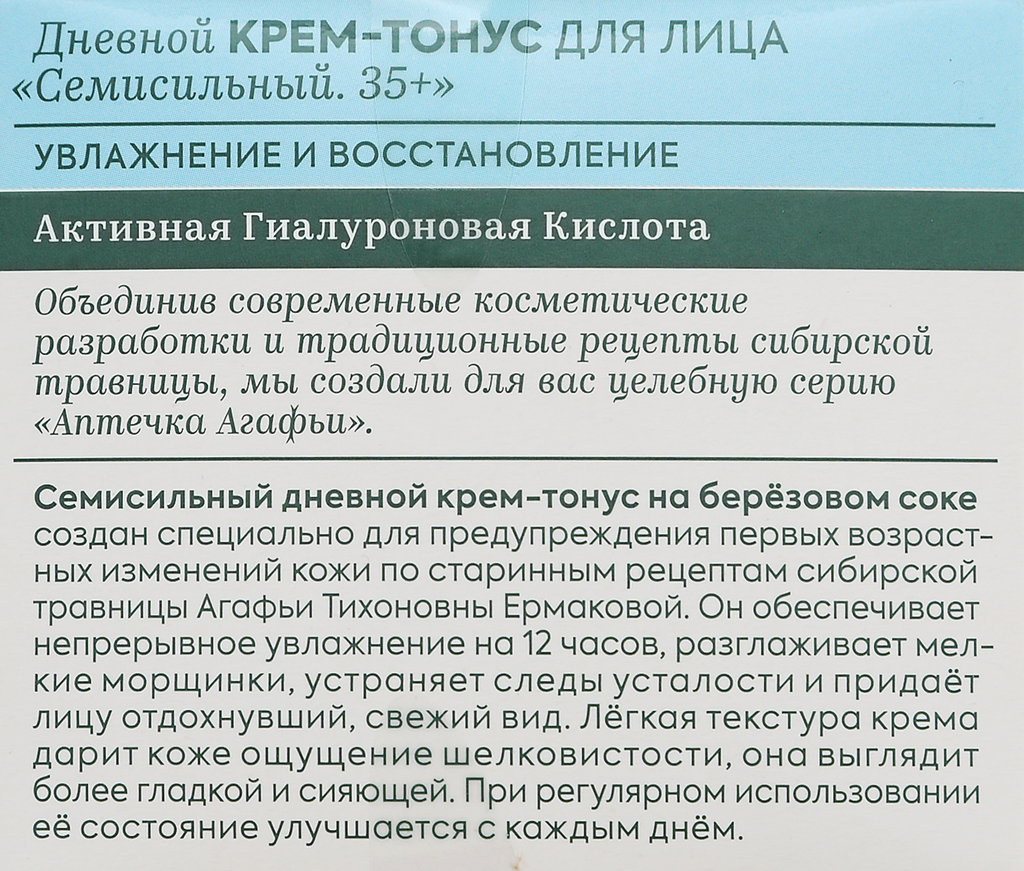 Семисильный дневной крем-тонус на берёзовом соке создан специально для предупреждения первых возрастных изменений кожи по старинным рецептам сибирской травницы Агафьи Тихоновны Ермаковой. Он обеспечивает непрерывное увлажнение на 12 часов, разглаживает мелкие морщинки, устраняет следы усталости и придаёт лицу отдохнувший, свежий вид. Лёгкая текстура крема дарит коже ощущение шелковистости, она выглядит более гладкой и сияющей. При регулярном использовании её состояние улучшается с каждым днём.