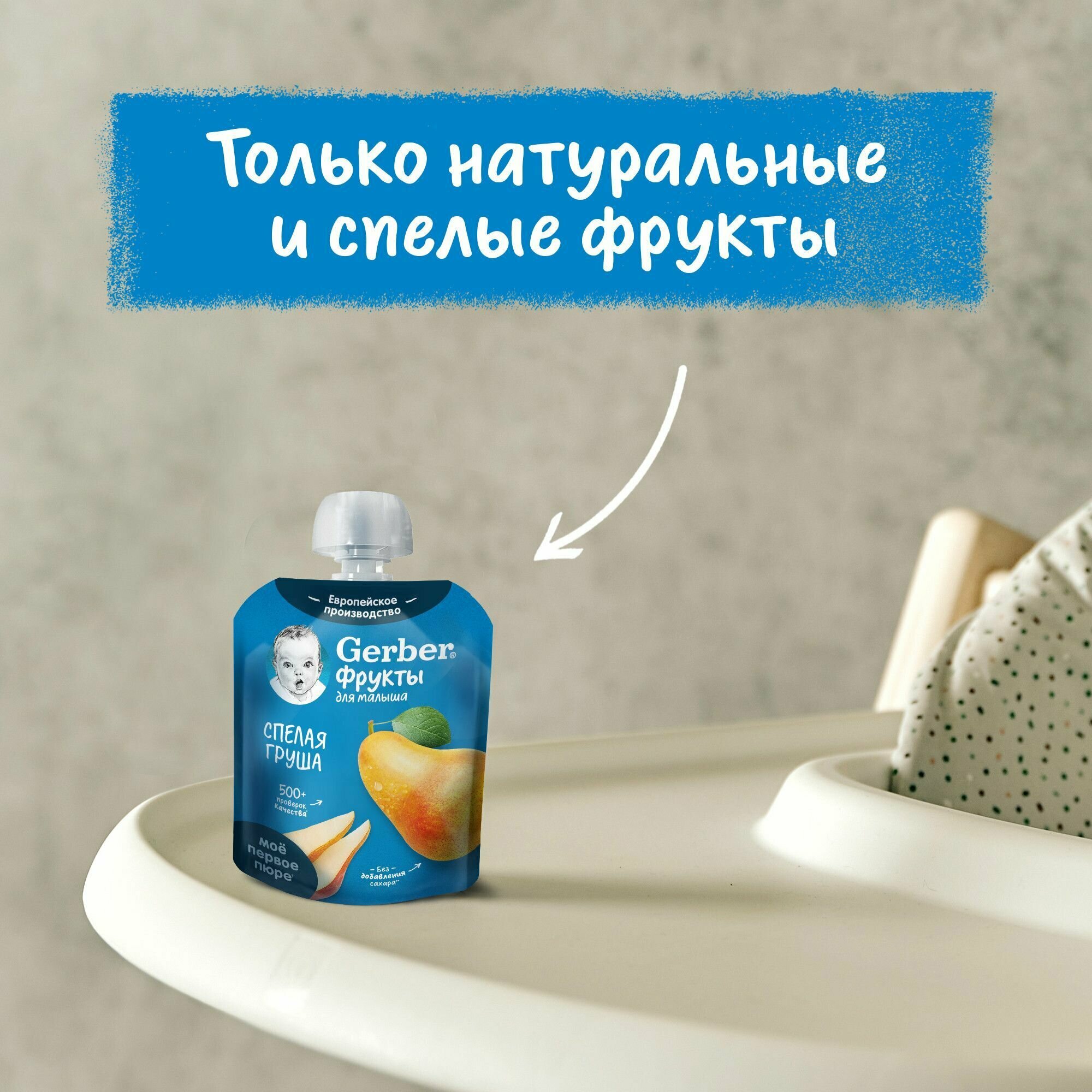 Изготовлено без использования генетически модифицированных ингредиентов, искусственных консервантов, красителей, ароматизаторов и сахара. Только лучшие фрукты собранные вручную попадают в детское питание Gerber. Продукция Gerber проходит более 500 проверок на разных этапах производства, чтобы предложить лучшее вашему малышу.