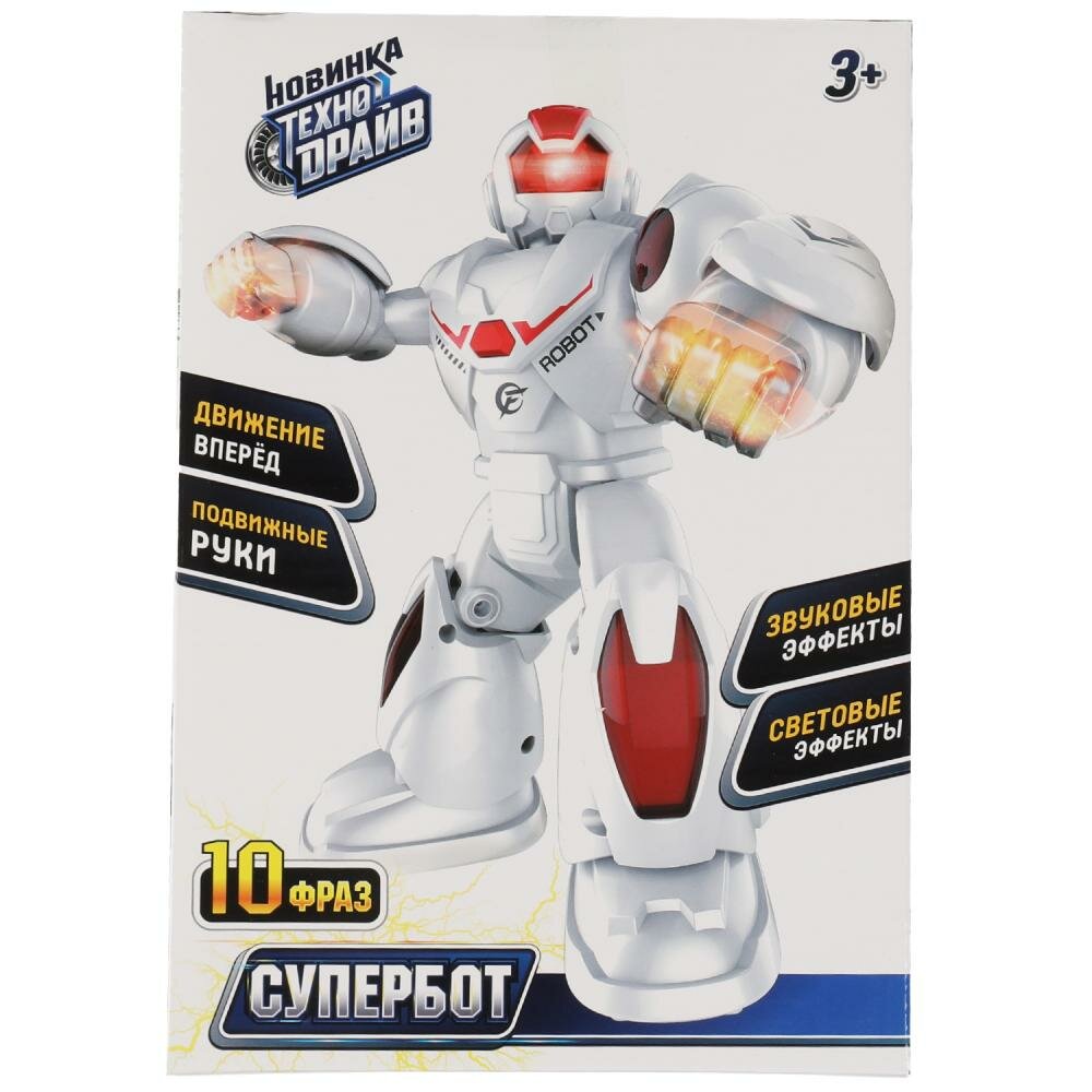 Робот Супербот ТМ Технодрайв станет прекрасным подарком для маленького любителя робототехники: световые эффекты, звуковое сопровождение, двигается вперед, подвижные руки, говорит 10 фраз. Вашему ребенку обязательно понравится этот яркий и современный робот. Такая игрушка не только развлечет малыша, но и привьет ему интерес к науке. Компактный размер позволяет повсюду брать робота с собой. Игра с роботом ТМ Технодрайв развивает: фантазию, моторику, пространственно-образное мышление, логику, скорость реакции. Работает от 2-х батареек типа АА (не входят в комплект).