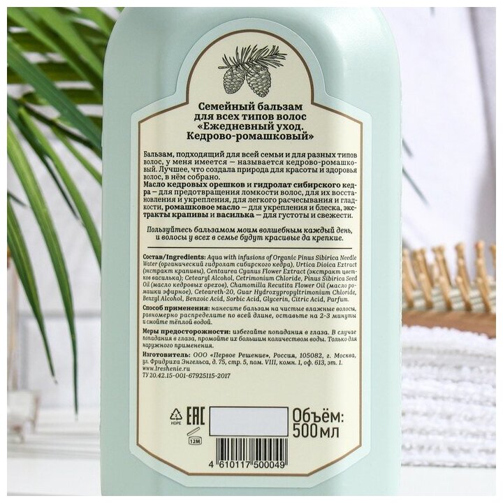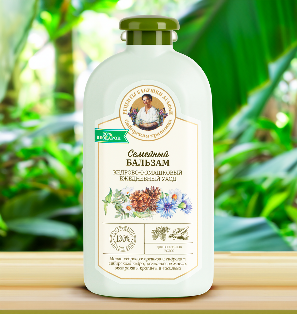 | Состав | Aqua with infusions of Pinus Sibirica Seed Oil (масло дикого сибирского кедра), Betula Alba Bud Extract (настой берёзовых почек), Potentilla Fruticosa Extract (экстракт белого курильского чая); Cetearyl Alcohol, Cetrimonium Chloride, Panthenol, Organic Linum Usitatissimum Seed Oil (органическое масло сибирского льна), Lauryl Glucoside, Guar Hydroxypropyltrimonium Chloride, Citric Acid, Tocopheryl Acetate (витамин Е), Benzyl Alcohol, Benzoic Acid, Sorbic Acid, Parfum. |
