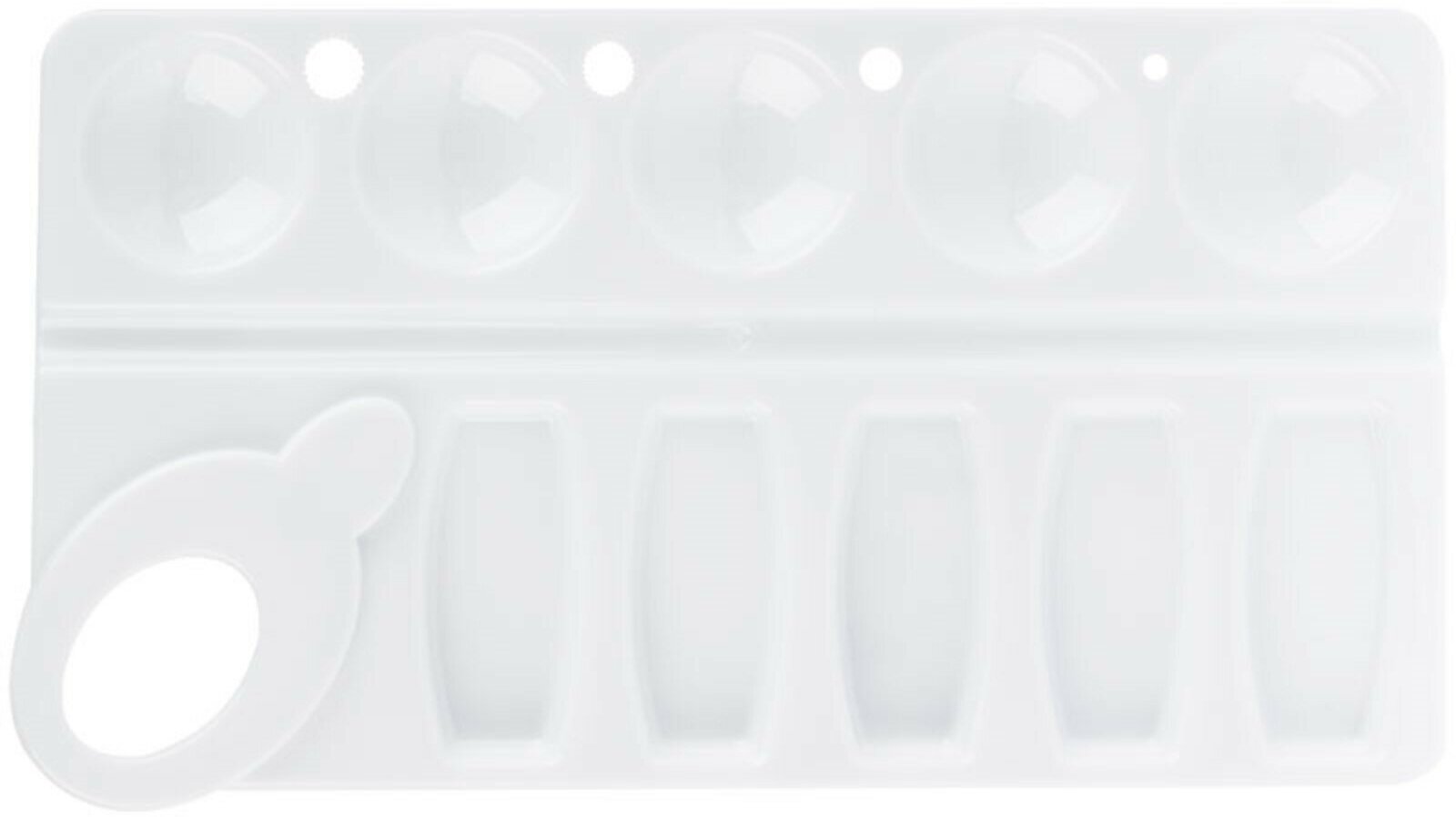 Палитра прямоугольная. Имеет 10 отделений для красок и 4 отверстия для кистей.