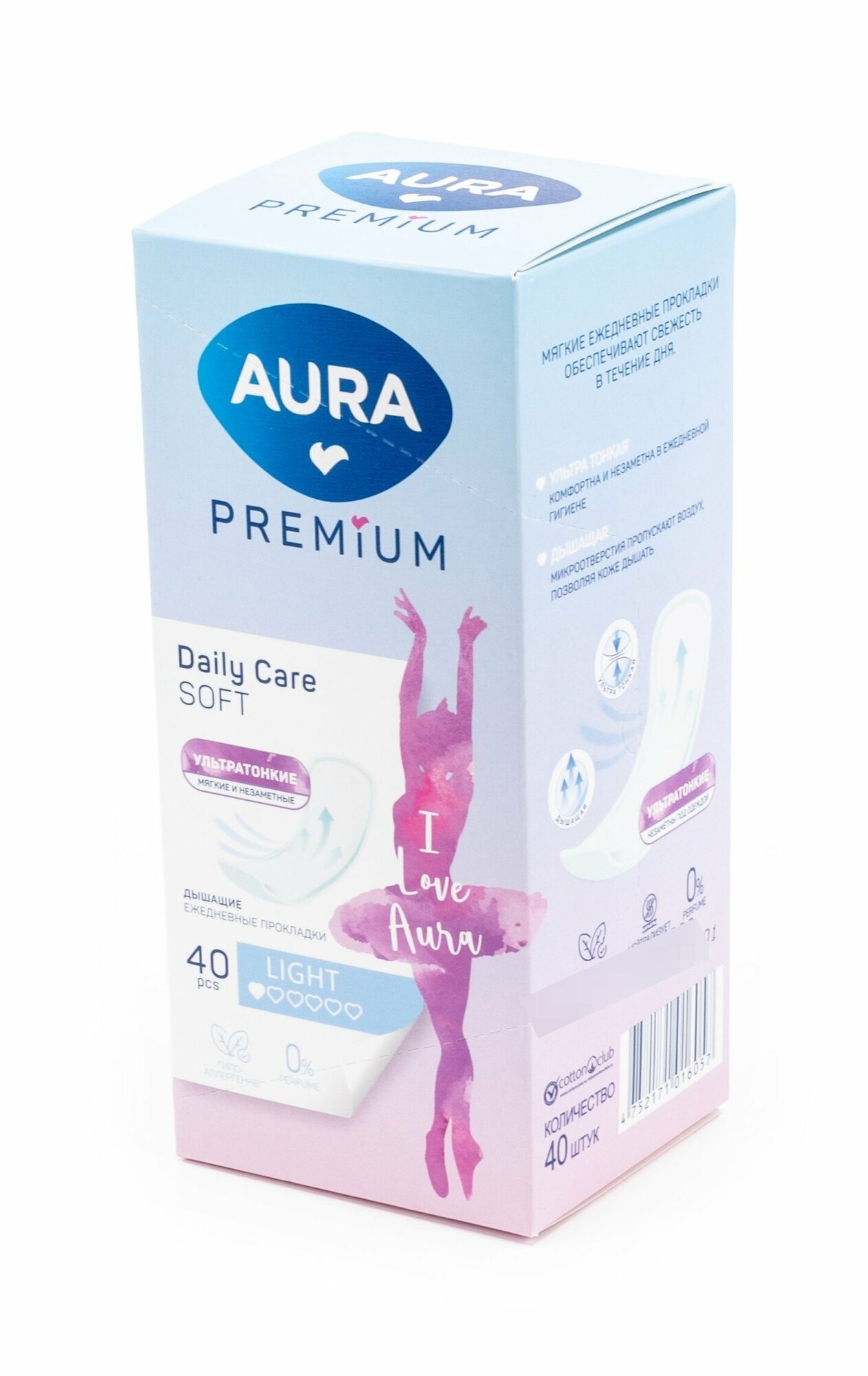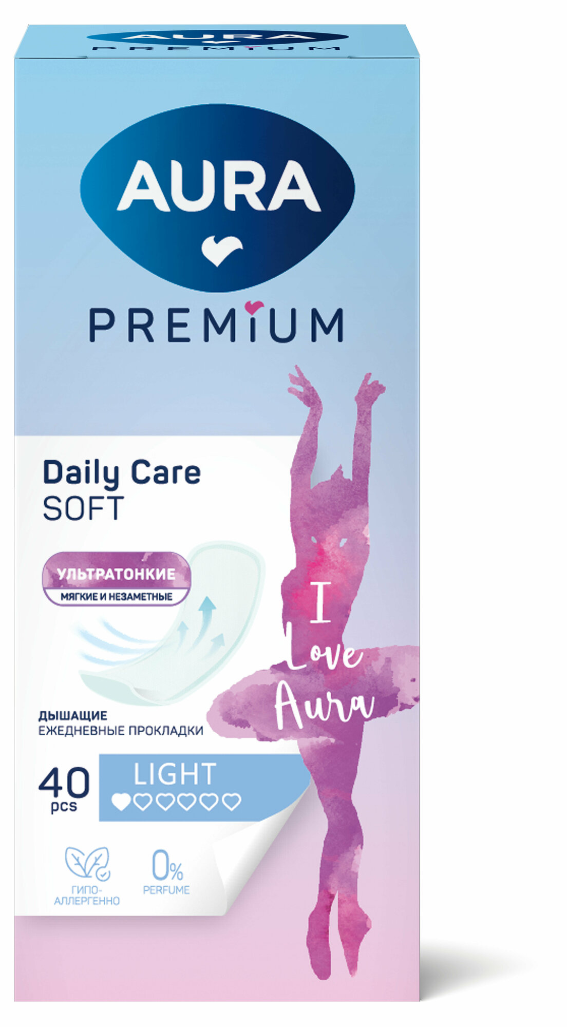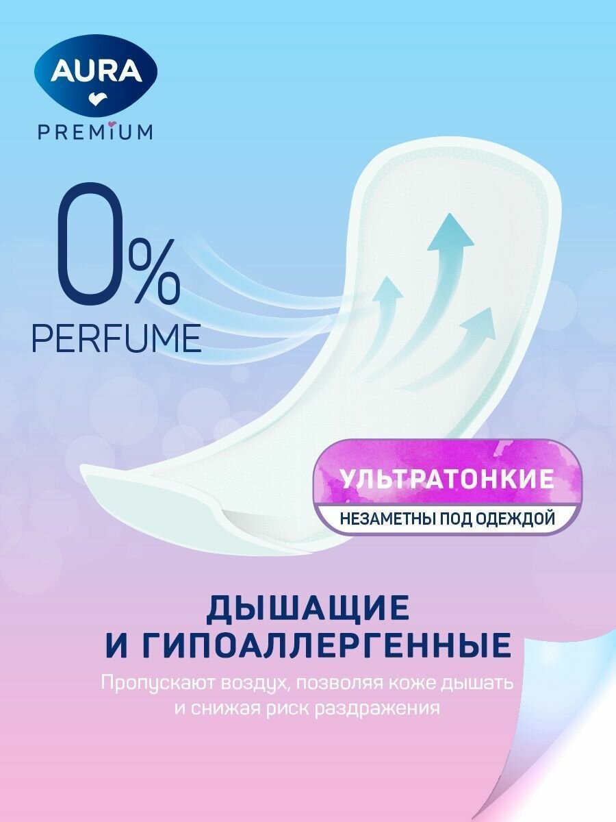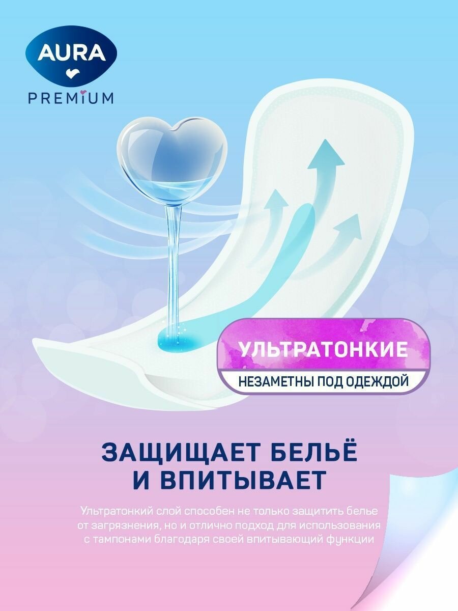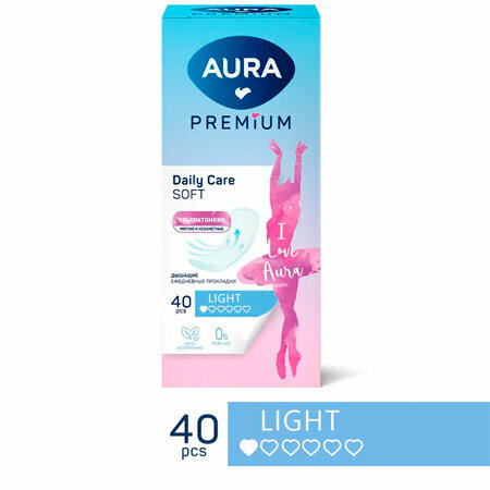 Ультратонкие прокладки AURA Premium LIGHT идеально подходят как для ежедневного использования, так и для защиты в последние дни цикла.