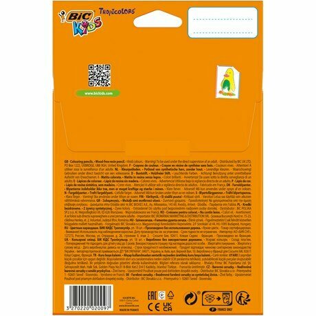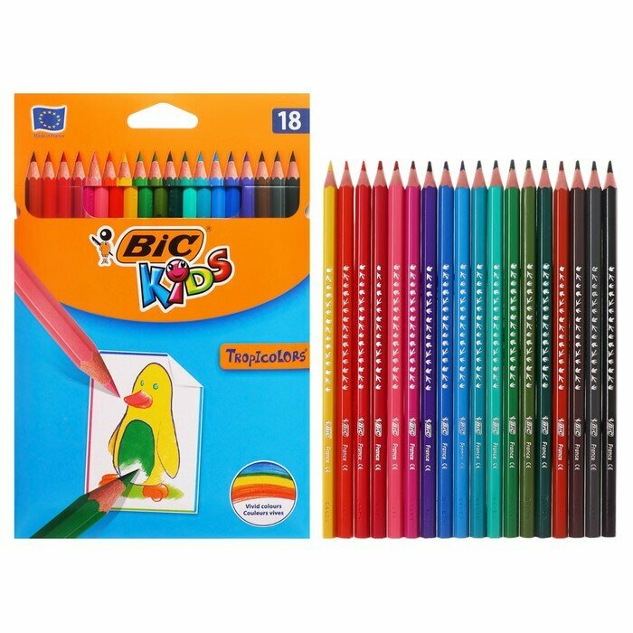 Цветные карандаши BIC Kids Tropicolors идеально подходят детям от 5 лет и старше. Корпус и грифель этих шестигранных карандашей для детей совпадают по цвету, поэтому дети очень легко найдут нужный среди всех. С грифелем диаметром 2,9 мм дети смогут легко создавать прекрасные рисунки. Насыщенный цветным пигментом грифель карандашей для рисования представлен 18 смелыми, яркими цветами. Карандаши изготовляют без использования древесины, поэтому они не образуют острых краёв на изломе. Уже более 65 лет BIC производит письменные принадлежности высокого качества. Линейка BIC Kids - это товары для рисования и раскрашивания, которые BIC разработала специально для развития творческого мышления у детей в начале их увлекательного пути в мир письма.