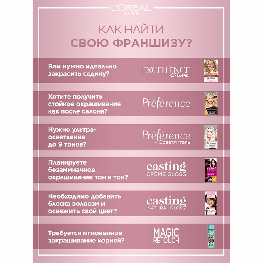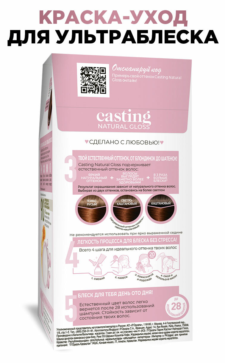 Новая коллекция состоит из 10 максимально натуральных оттенков. Обновленная формула оптимально подойдет для закрашивания первых седых волосков. Всего 20 минут и ваши волосы заряжены блеском, усилены наукой! Способ применения: