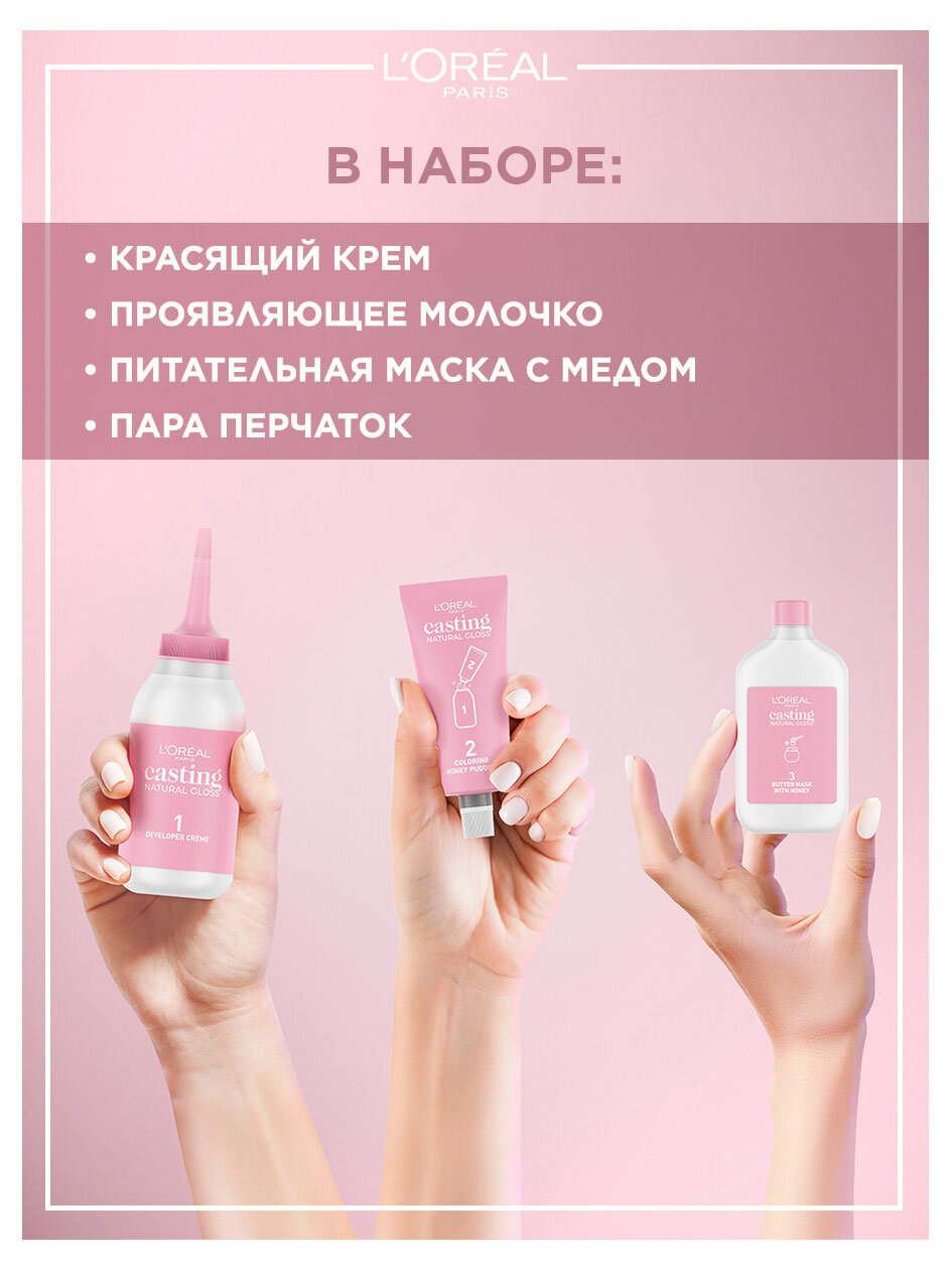 | Состав набора | красящий крем; проявляющее молочко; питательная маска с медом; пара перчаток |
