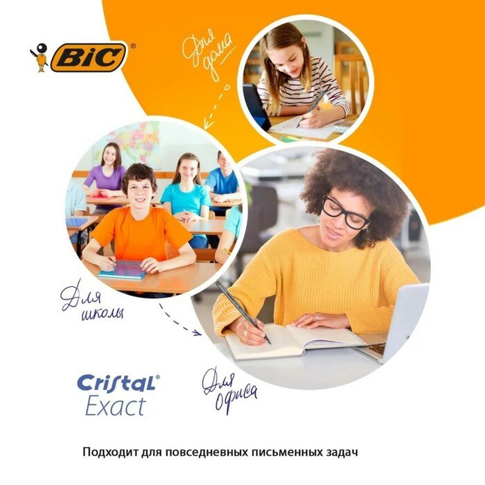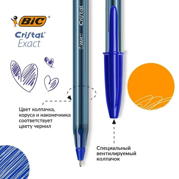Когда в 1950 году бренд BIC представил публике шариковую ручку BIC Cristal, она произвела революцию в сфере письма. Bic Cristal на сегодняшний день является самой продаваемой ручкой в мире, выставляется в музеях и продолжает совершенствоваться и адаптироваться под конкретные цели. В этой коробке находится 20 синих шариковых ручек BIC Cristal Exact с острием иглы 0,7 мм, позволяющим создавать средние линии шириной 0,28 мм. Эти элегантные шариковые ручки оценят все, кто любит красивый текст, чистое письмо и точные результаты. Идеально подходят для использования в школе, в офисе или дома. BIC Cristal Exact скользит по странице, поскольку безупречно сконструированный шарик обеспечивает постоянный поток чернил. Колпачки, корпусы и наконечники для ручек соответствуют цвету чернил, поэтому вам всегда будет легко найти нужный цвет в пенале или на столе.