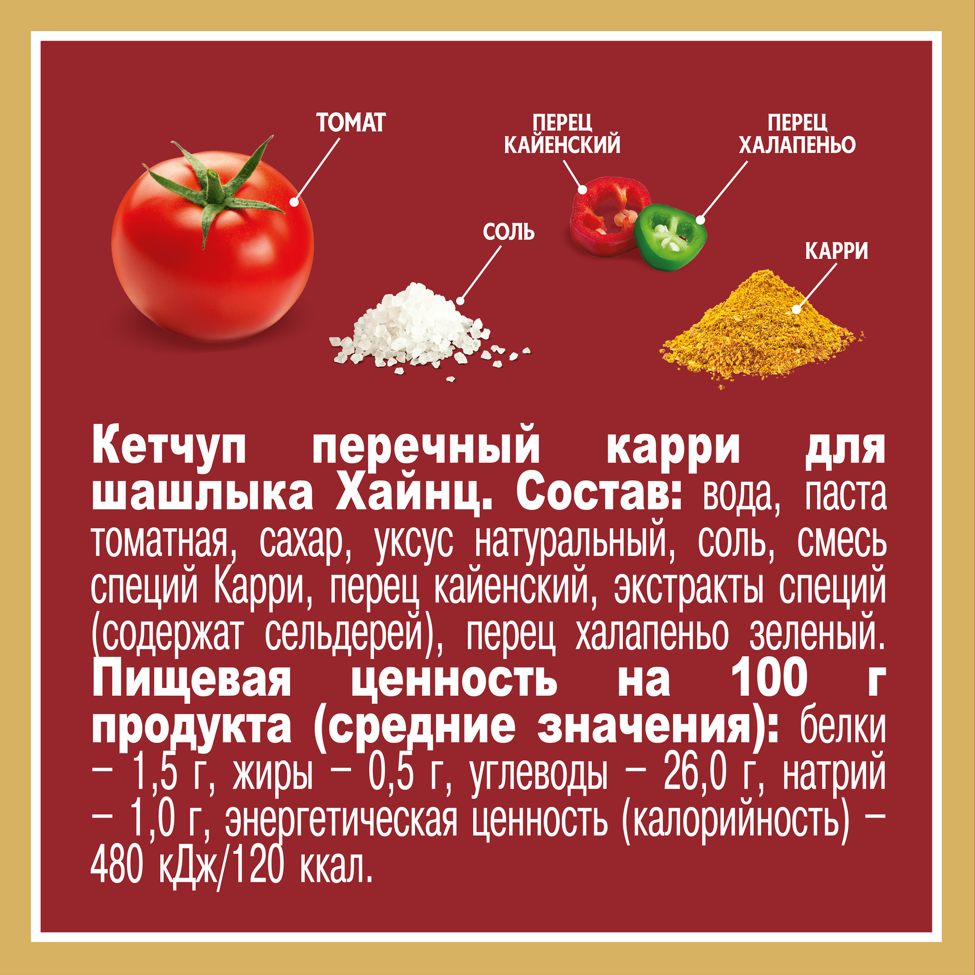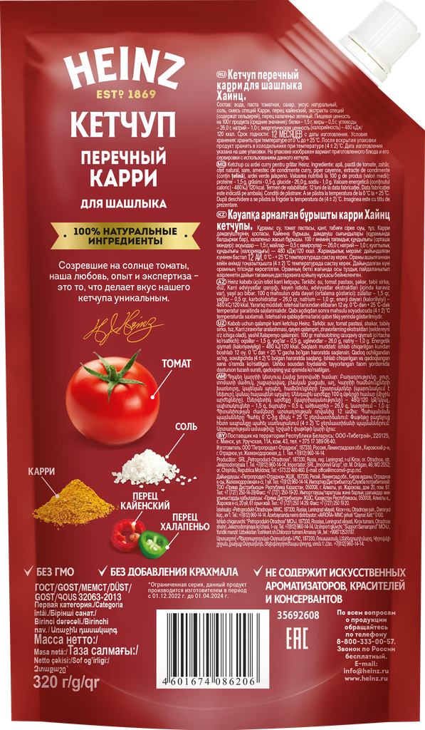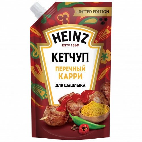 Томатный кетчуп Перечный карри для шашлыка - это лимитированная новинка от Heinz, которая добавит пряный восточный оттенок мясу и птице на гриле. Кетчуп Heinz создан из натуральной томатной пасты, душистого карри и смеси перцев кайенского и халапеньо. Для томатной пасты Heinz использует отборные плоды специального сорта, выращенные на солнце в открытом грунте под особым контролем компании.