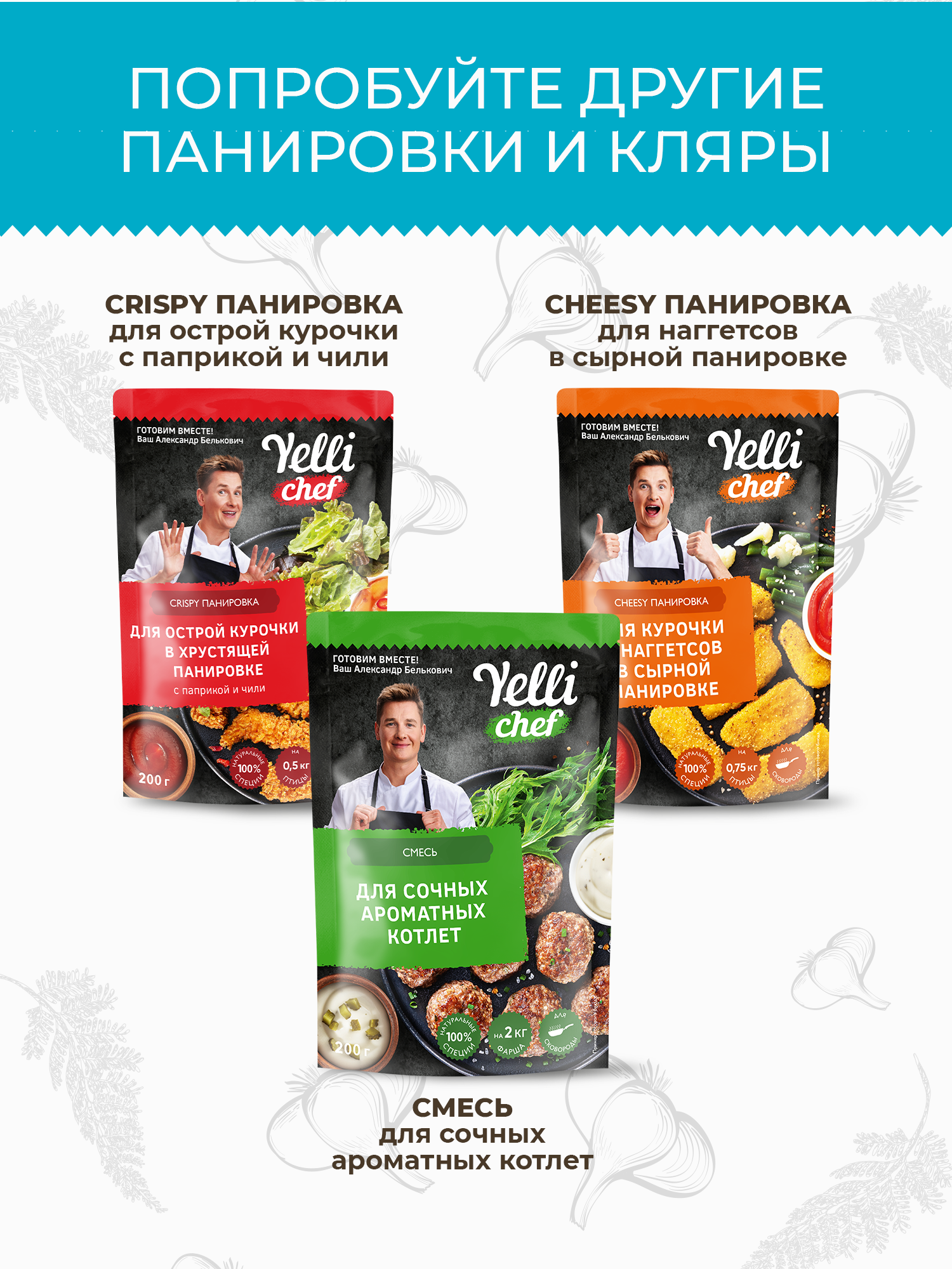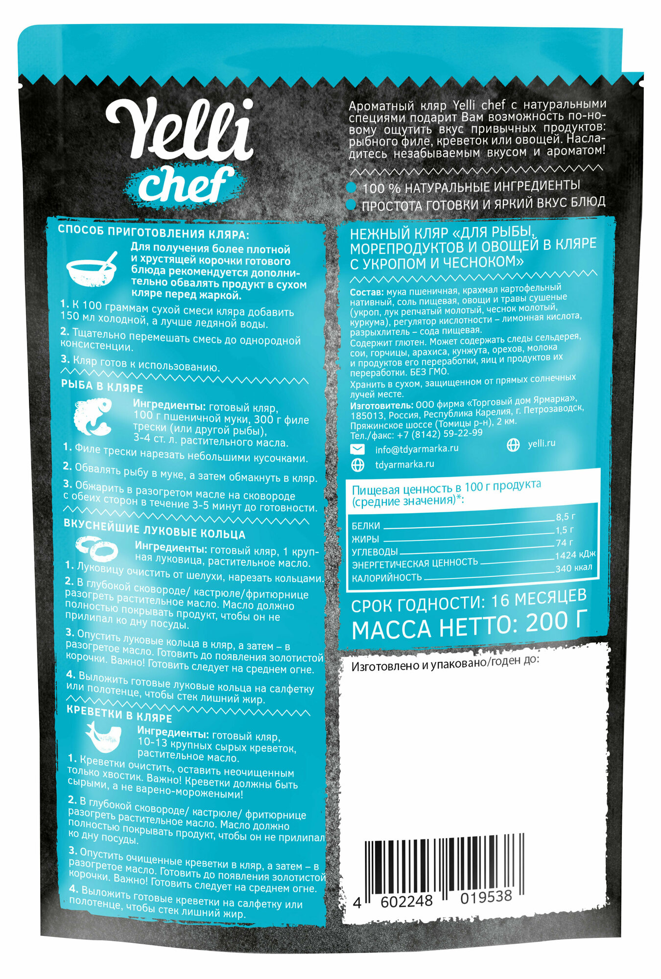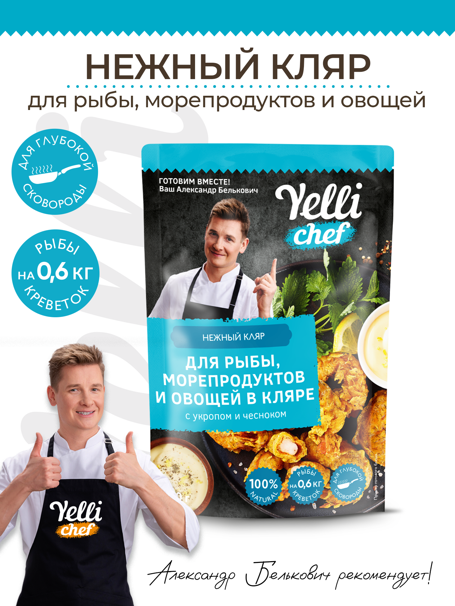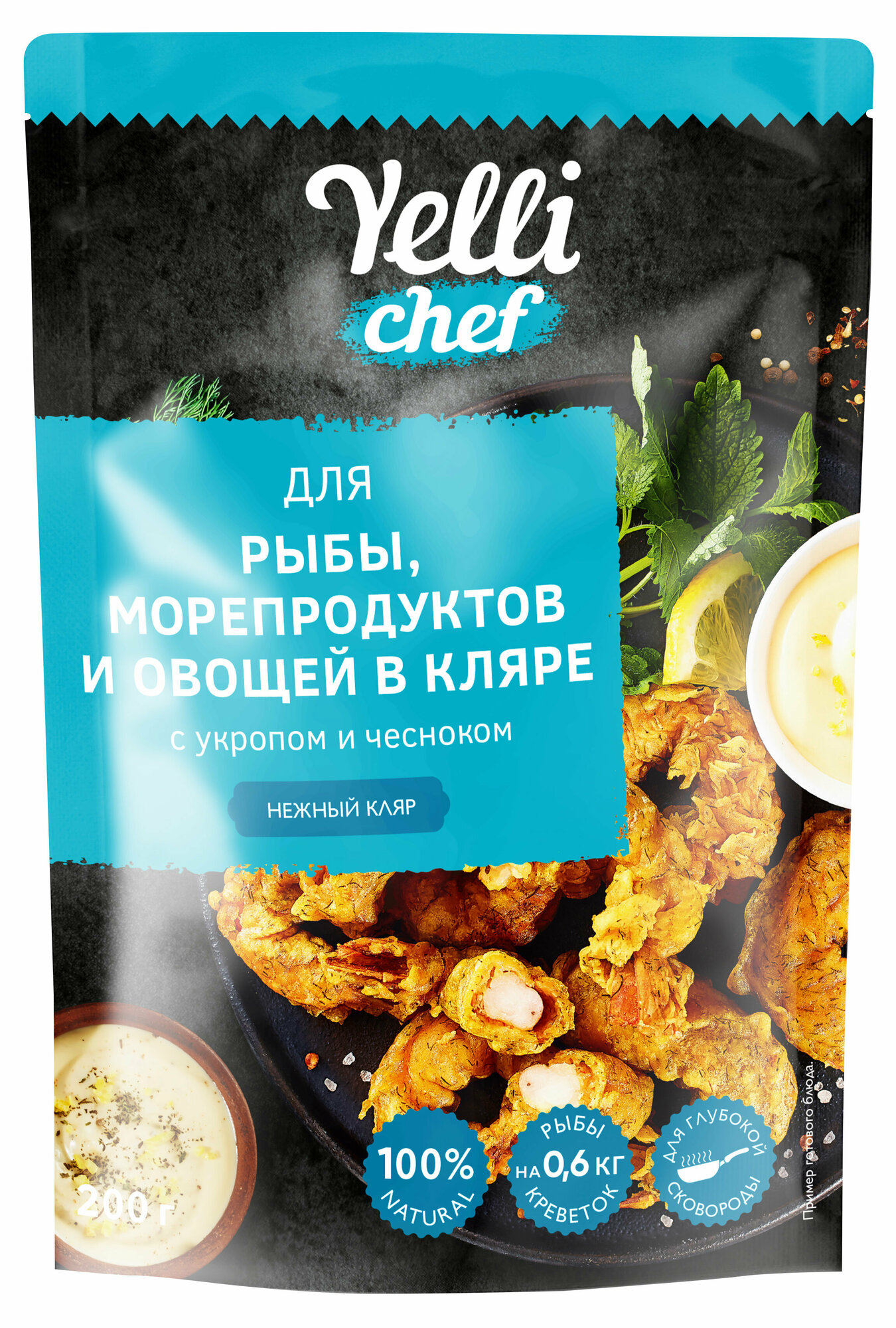 Ароматный кляр Yelli chef с натуральными специями подарит вам возможность по-новому ощутить вкус привычных продуктов: рыбного филе, креветок или овощей. Насладитесь незабываемым вкусом и ароматом!
