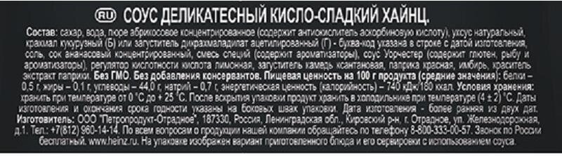 | Состав | сахар, вода, пюре абрикосовое концентрированное (содержит антиокислитель аскорбиновую кислоту), уксус натуральный, крахмал кукурузный или загуститель дикрахмаладипат ацетилированный, соль, сок ананасовый концентрированный, смесь специй (содержит ароматизаторы), соус уорчестер (содержит глютен, рыбу и ароматизаторы), регулятор кислотности кислота лимонная, загуститель камедь ксантановая, паприка красная, имбирь, краситель экстракт паприки. |