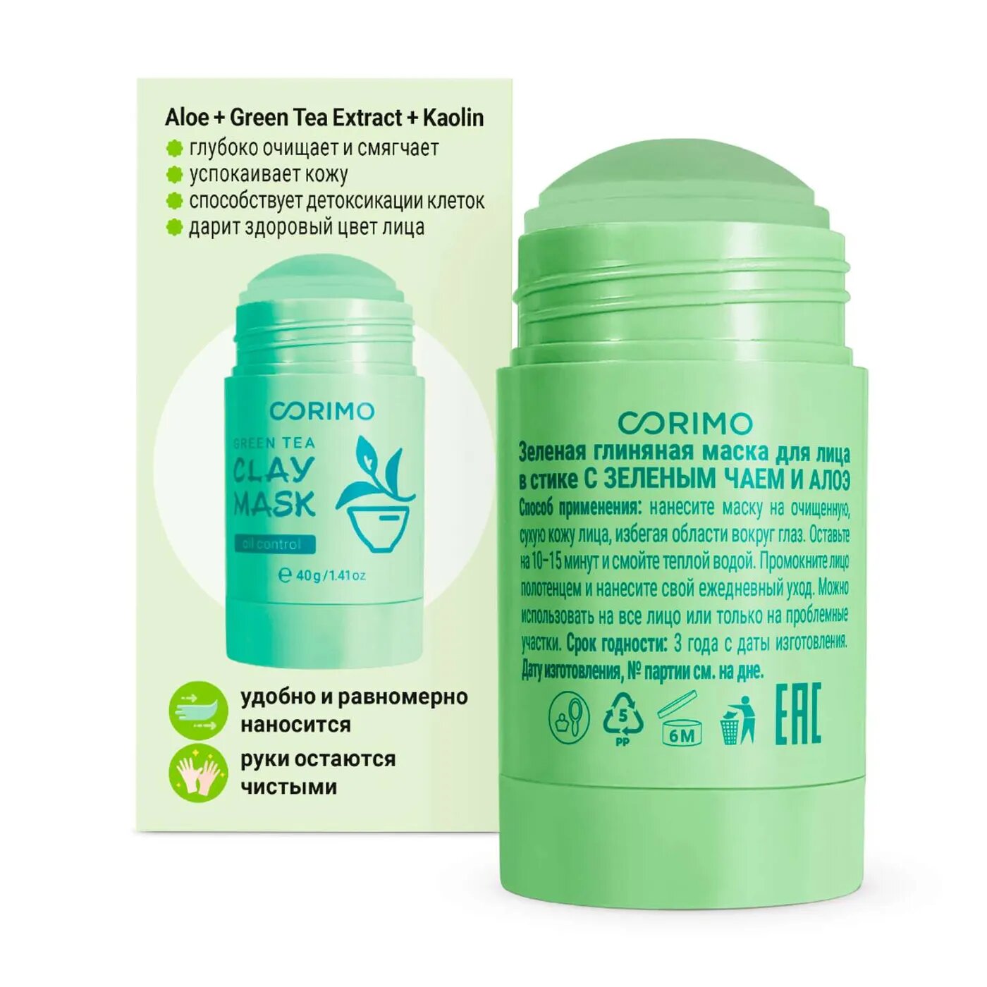 Маска для лица в стике Corimo Зеленая глиняная с зеленым чаем и алоэ 40 г