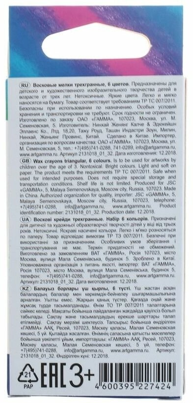 Мелки восковые Гамма Классические трехгранные 6 цветов