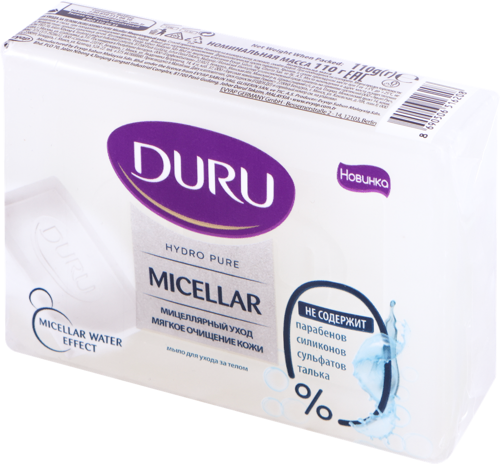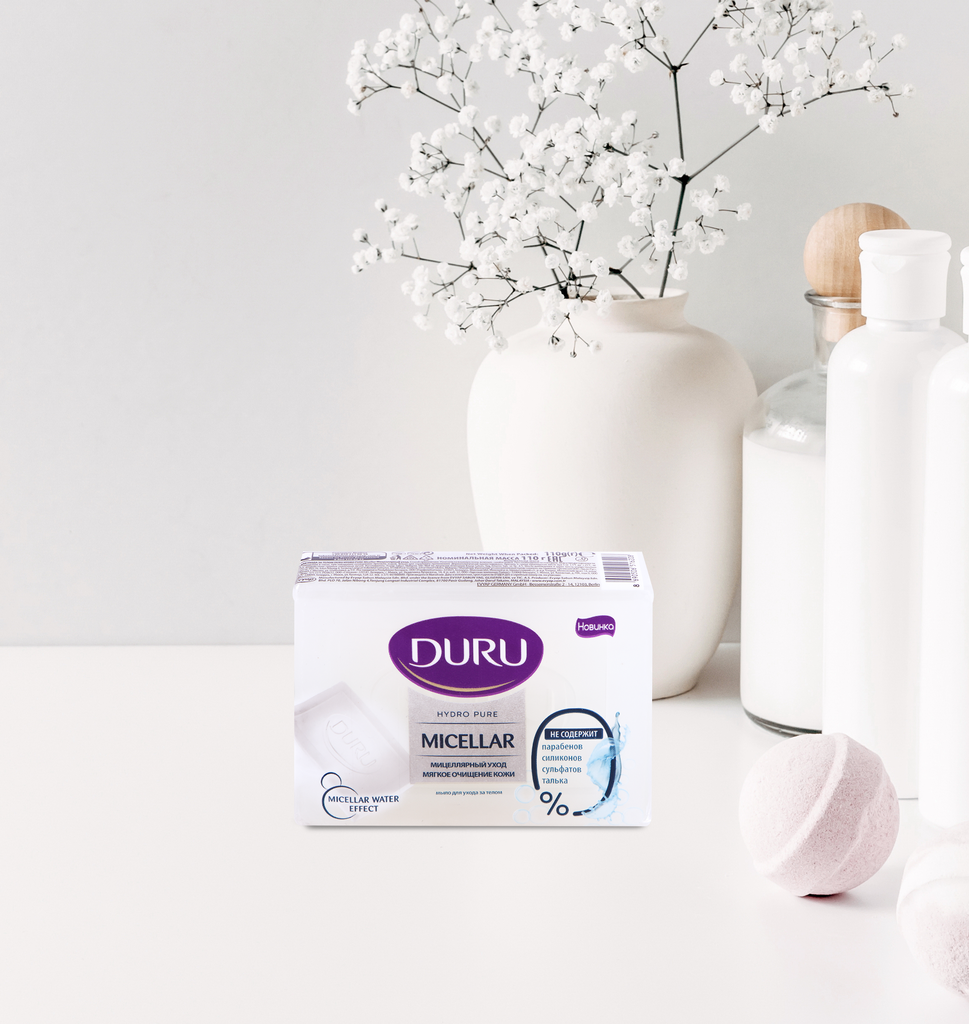 Мыло DURU HYDRO PURE соединяет в себе очищение мицеллярной воды и заботу о коже благодаря специальной мягкой формуле! Мицеллярная вода как магнит притягивает загрязнения, обеспечивая бережное очищение и увлажнение вашей кожи.