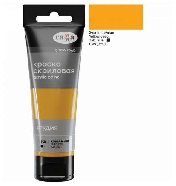 Новая акриловая краска серии Студия темного желтого цвета предназначена для художественно-живописных и декоративно-прикладных работ. Главные отличия: насыщенный цвет, густая консистенция, высокая адгезия, прочность красочного слоя. После высыхания краска становится глянцевой, практически не темнеет, специальная добавка позволяет максимально раскрыть красоту цвета. Художественный акрил прекрасно разносится, подходит для бумаги, картона, грунтованного холста, дерева, стекла, кожи, ткани. Время высыхания: от 10 минут до 1 часа в зависимости от толщины слоя. Прозрачный корпус тубы позволяет увидеть цвет краски, а удобная крышка флип-топ предотвращает высыхание.