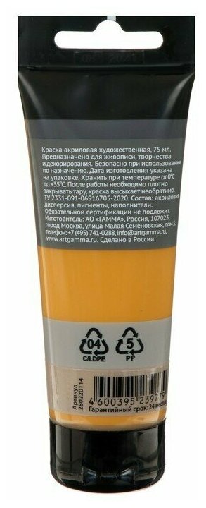 Новая акриловая краска Студия цвета золотистая охра предназначена для художественно-живописных и декоративно-прикладных работ. Главные отличия: насыщенный цвет, густая консистенция, высокая адгезия, прочность красочного слоя. После высыхания краска становится глянцевой, практически не темнеет, специальная добавка позволяет максимально раскрыть красоту цвета. Художественный акрил прекрасно разносится, подходит для бумаги, картона, грунтованного холста, дерева, стекла, кожи, ткани. Время высыхания: от 10 минут до 1 часа в зависимости от толщины слоя. Прозрачный корпус тубы позволяет увидеть цвет краски, а удобная крышка флип-топ предотвращает высыхание.