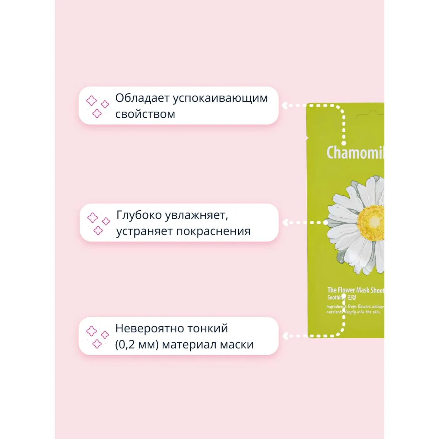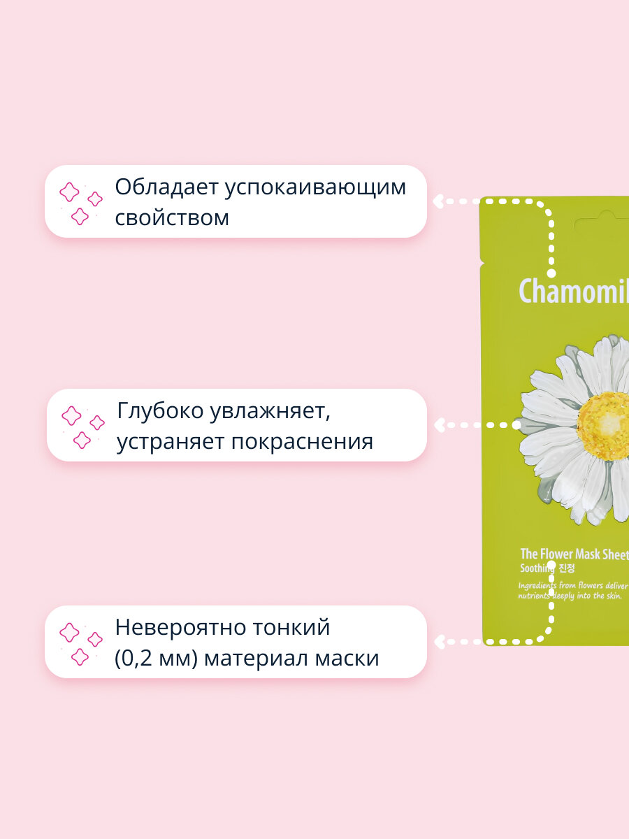 Специальный материал тканевой маски создан невероятно тонким, он практически неощутим на коже и обеспечивает лучшее проникновение полезных компонентов. Активный компонент экстракт ромашки обладает мощными успокаивающими свойствами, глубоко увлажняет, устраняет покраснения и раздражения кожи.