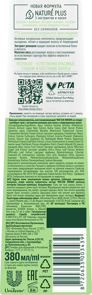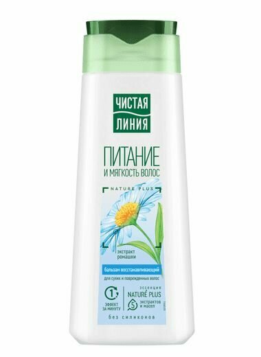 Бальзам от Чистой Линии с усиленной формулой! Естественно красивые, гладкие и блестящие волосы результат, которого можно достичь с восстанавливающими продуктами от бренда Чистая Линия. Бальзам-ополаскиватель восстанавливающей серии на 97% состоит из компонентов натурального происхождения. Эссенция Nature Plus содержит 5 экстрактов и масел масел (экстракты вербены, шалфея, шиповника, масло миндаля и льна). Активные натуральные компоненты предупреждают выпадение, питают и защищают волосы от повреждений: - Экстракт вербены успокаивает кожу головы и действует общеукрепляюще. - Шалфей способствует питанию кожи головы, укреплению и росту волос. - Экстракт шиповника, богатый витаминами и известный своими восстанавливающими свойствами, стимулирует рост волос. - Масло льна питает и смягчает кожу и волосы. - Миндальное масло нормализует секрецию, восстанавливает и придает здоровый блеск. - Экстракт ромашки придает волосам естественный блеск и мягкость. - Молочко овса разглаживает волосы и восстанавливает их естественную структуру без эффекта жирности и утяжеления.