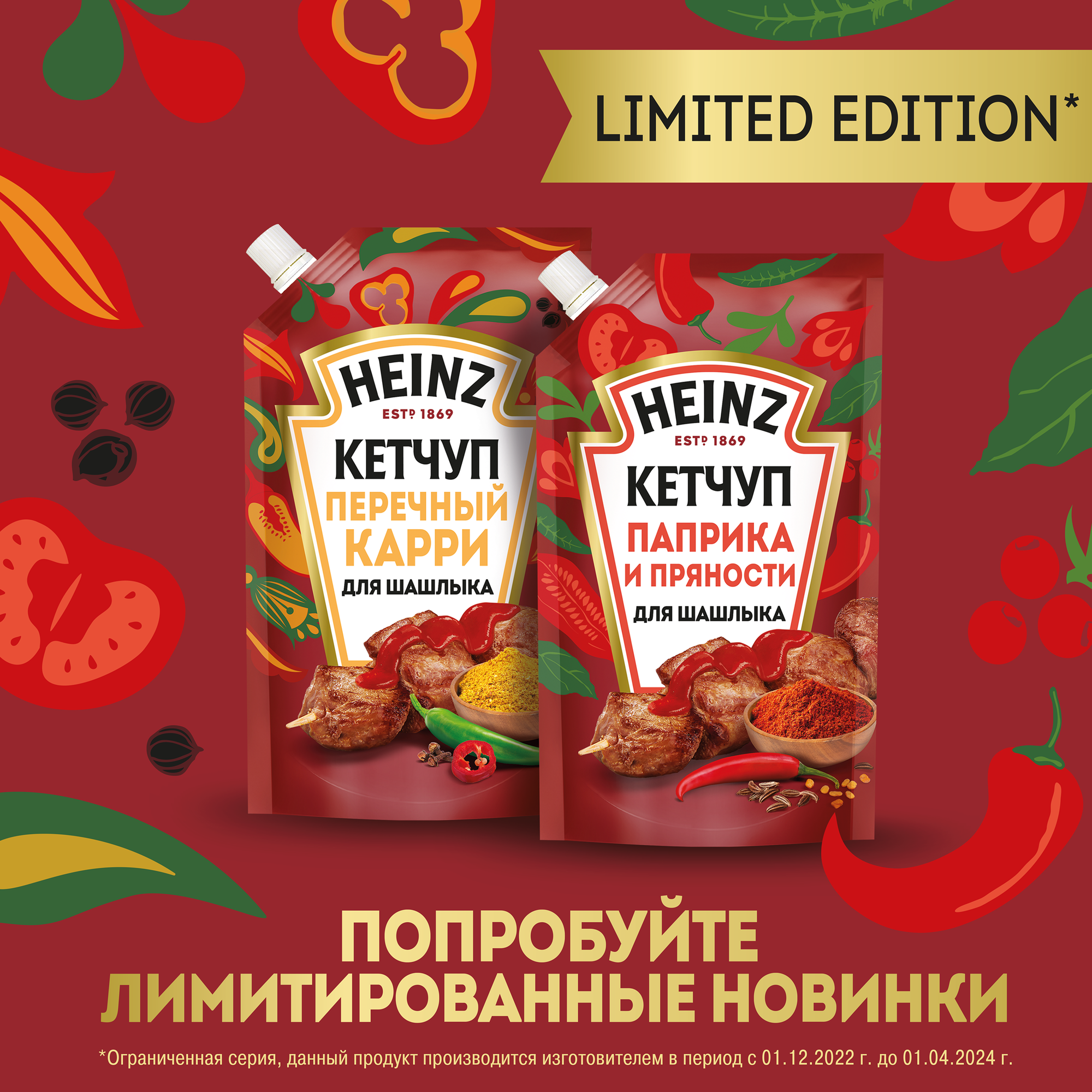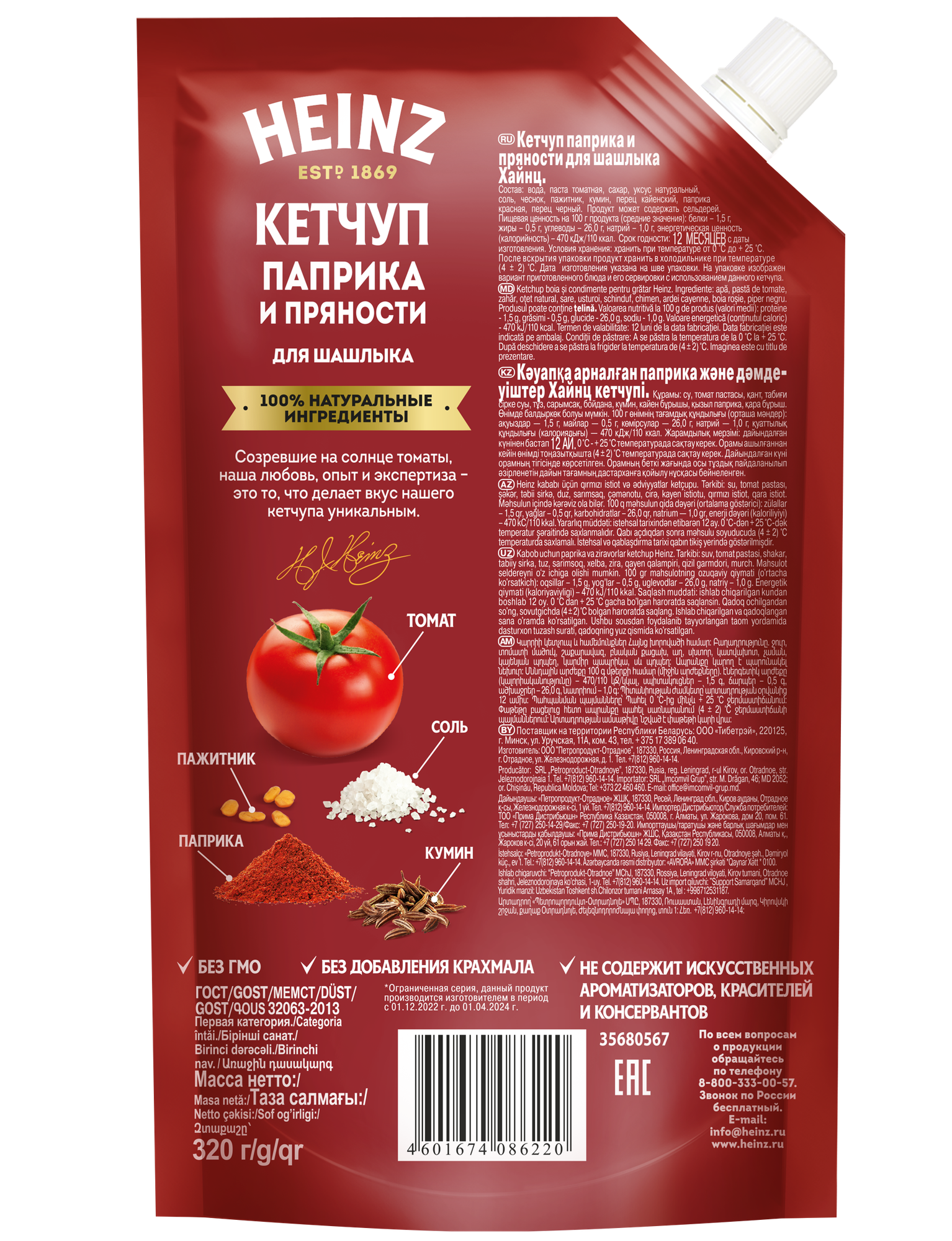 Томатный Кетчуп с паприкой и пряностями для шашлыка это лимитированная новинка от Heinz, великолепный шашлычный кетчуп из натуральной томатной пасты и целым букетом ароматных приправ. Помимо экстрактов кумина и пажитника, кетчуп содержит целых три вида перца красную паприку, черный и кайенский. Тройной перечный аккорд порадует любителей шашлыков и других видов мяса на гриле.