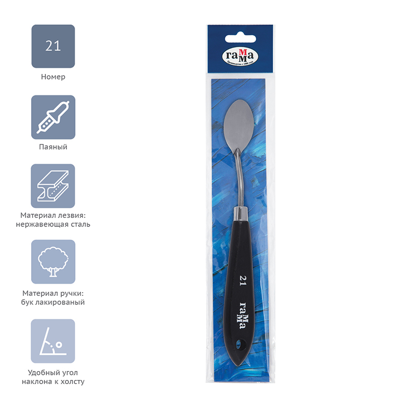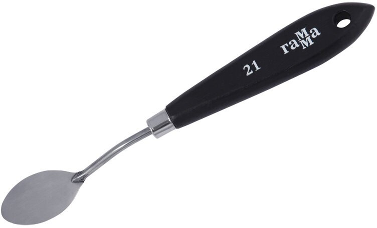 Паяный мастихин из нержавеющей стали с удобной плоской ручкой из натурального бука. Сварное соединение ручки и лезвия дает больший угол наклона мастихина к холсту, снижая вероятность случайного касания и смазывания краски. Форма лезвия овальная.