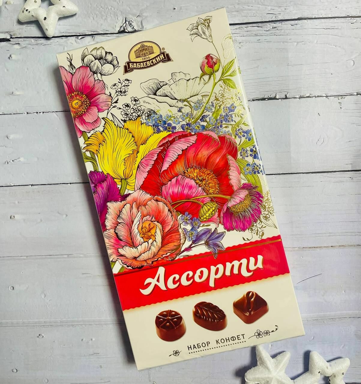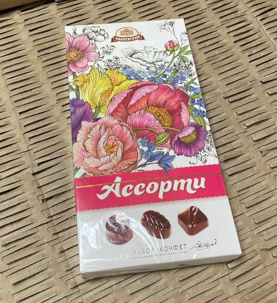 Ассорти конфет Букеты от концерна Бабаевский в коробках с изображениями пышных букетов. Такая коробка два в одном: и цветы, и шоколадные конфеты. Внутри три вида начинки: ароматная шоколадно-фруктовая, нежная сливочно-помадная и густая шоколадная. Каждую скрывают плотные стены настоящего шоколада Бабаевский ароматного, тающего, с многогранным вкусом.