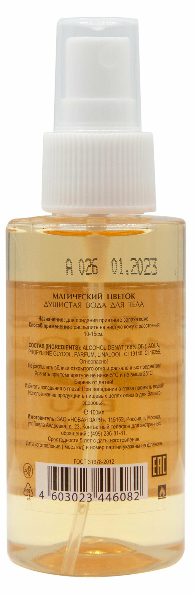 Магия обольщения! Если Вам нравятся духи "Магический цветок", то стоит дополнить свою коллекцию душистой водой для тела с таким же ароматом. Душистая вода прекрасно ложится на кожу и делает ее мягкой и нежной. Окутывая кожу ароматом любимых духов душистая вода дарит ей нежный парфюмерный шлейф. Подходит для дневного использования, особенно в жаркое время года.