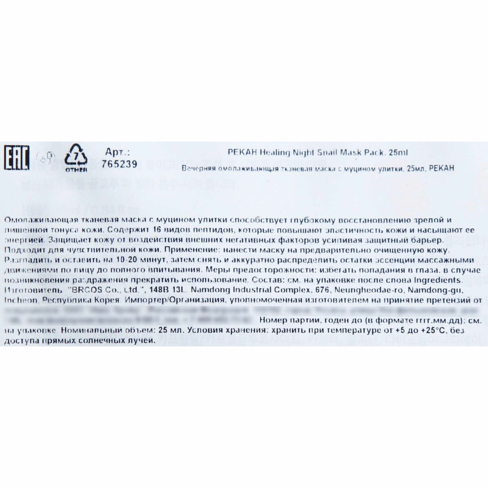 Маска для лица Pekah Вечерняя омолаживающая тканевая с муцином улитки 25 мл