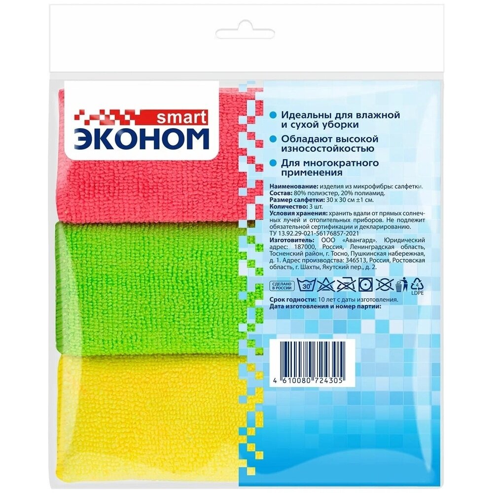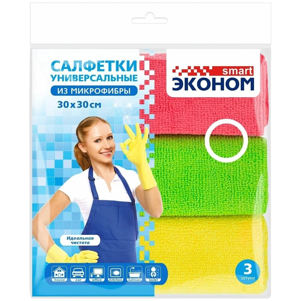 Салфетки из микрофибры Эконом smart ваш лучший помощник в уборке! Универсальная, многоразовая и бюджетная все эти характеристики применимы к ткани из микрофибры. Салфетки Эконом smart отлично впитывают воду, хорошо собирают пыль, справляются с разводами на любых зеркальных и стеклянных поверхностях. Салфетки значительно экономят бюджет, их можно стирать в ручную или в стиральной машинке и заново использовать.