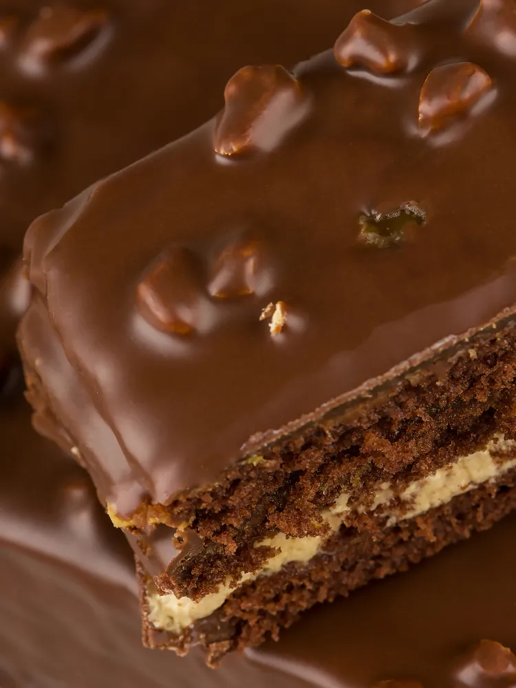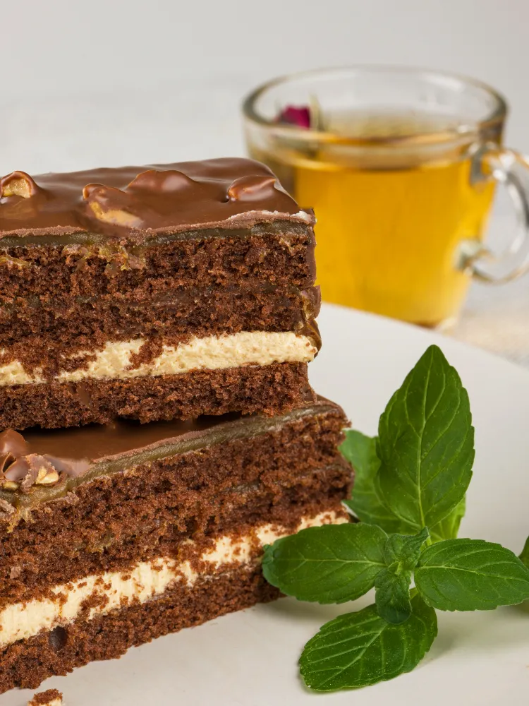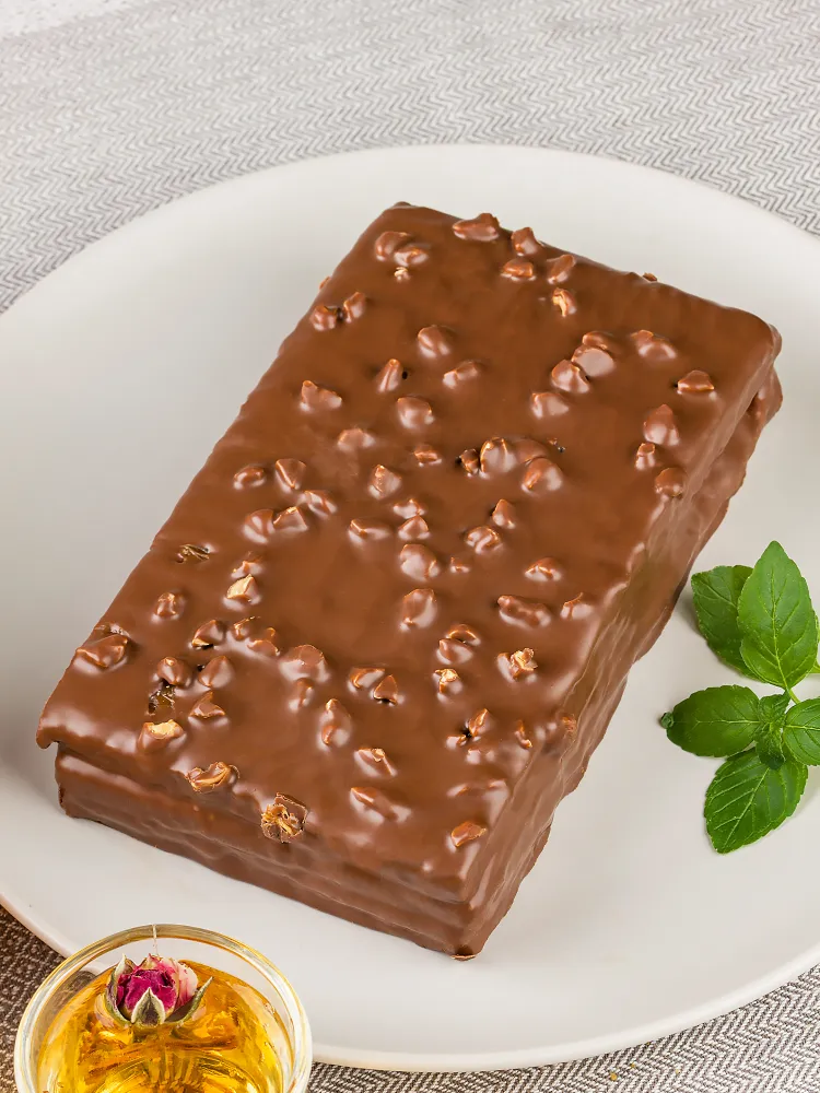 Торт Тоффи "День торта" - торт на основе нежного трюфельного бисквита, прослоен двумя видами начинок: мягкой сливочной карамелью и легким тоффи-кремом. Сверху посыпан обжаренным арахисом и покрыт глазурью со вкусом молочного шоколада.