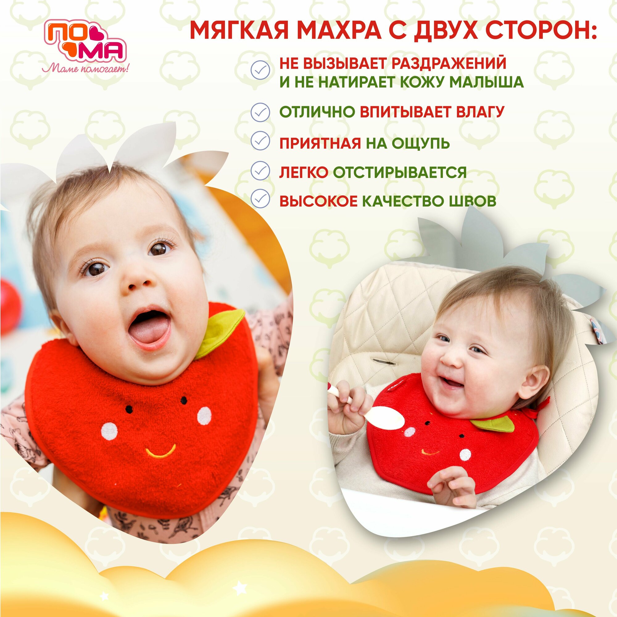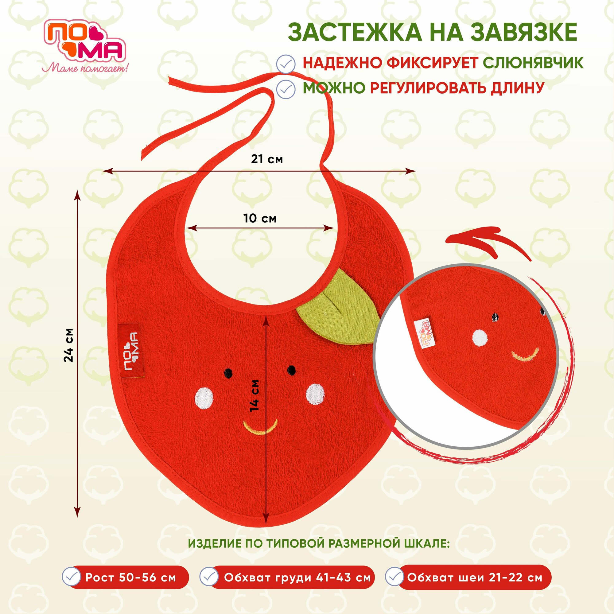 Фартук нагрудный махровый на завязках - незаменимый помощник при кормлении малыша. Увлекательный дизайн поможет кормить и играть, устрой фруктовый переполох вместе с фартуком Яблоко! Изготовлен из экологичных материалов, качество которых соответствует мировым стандартам. Универсальная расцветка. Размер: рост - 63-68 см; обхват груди - 47- 49 см; обхват шеи - 22 - 23 см. Строго соблюдайте инструкции по эксплуатации на упаковках каждого изделия.