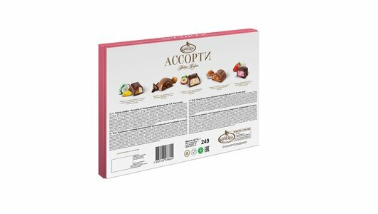 Шоколадные конфеты с пятью различными начинками: с помадно-желейной начинкой с оригинальным вкусом Пина-колады в темном шоколаде; с шоколадной начинкой с дробленым фундуком в молочном шоколаде; с нежной молочной начинкой с дробленым фундуком в темном шоколаде; с восхитительной начинкой со вкусом карамели в молочном шоколаде; с ароматной начинкой со вкусом клубники со сливками в темном шоколаде.