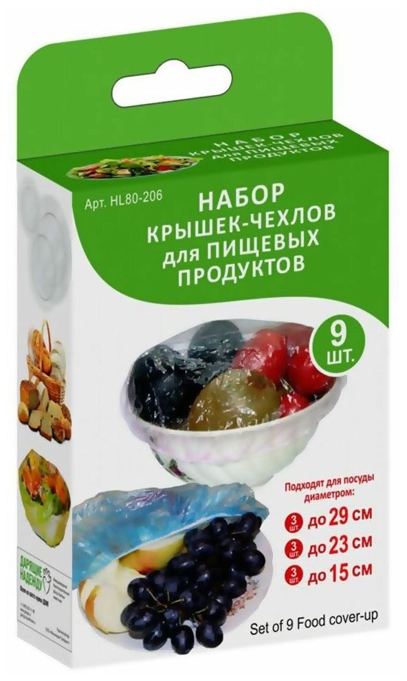 Полиэтиленовые крышки-чехлы с резинкой предназначены для защиты пищевых продуктов от заветривания, загрязнения, посторонних запахов и от насекомых при нахождении продуктов на открытом воздухе. Сохранят свежесть и аппетитный внешний вид. Они легко снимаются и одеваются, закрепляются на тарелке за счет резинки, которая обеспечивает герметичность. Крышки-чехлы имеют три размера, что позволяет их использовать на различных емкостях: тарелках, салатницах, кувшинах, банках и т.д. Подходят для посуды диаметром: 3 шт - до 40 см, 3 шт - до 22 см, 3шт - до 16 см.
