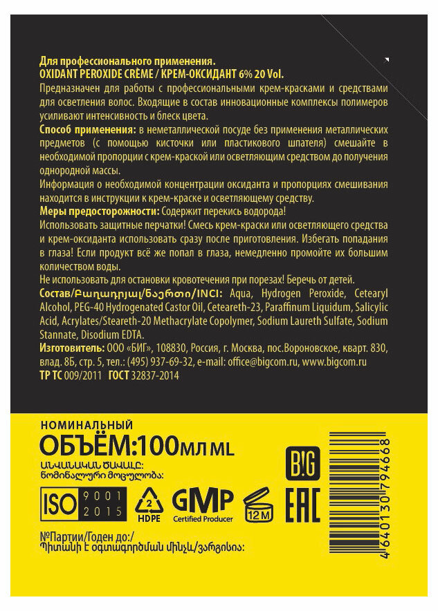 | Способ применения | В неметаллической посуде без применения металлических предметов (с помощью кисточки или пластикового шпателя) смешайте в необходимой пропорции с крем-краской или осветляющим средством до получения однородной массы. Информация о необходимой концентрации оксиданта и пропорциях смешивания находится в инструкции к крем-краске и осветляющему средству. |