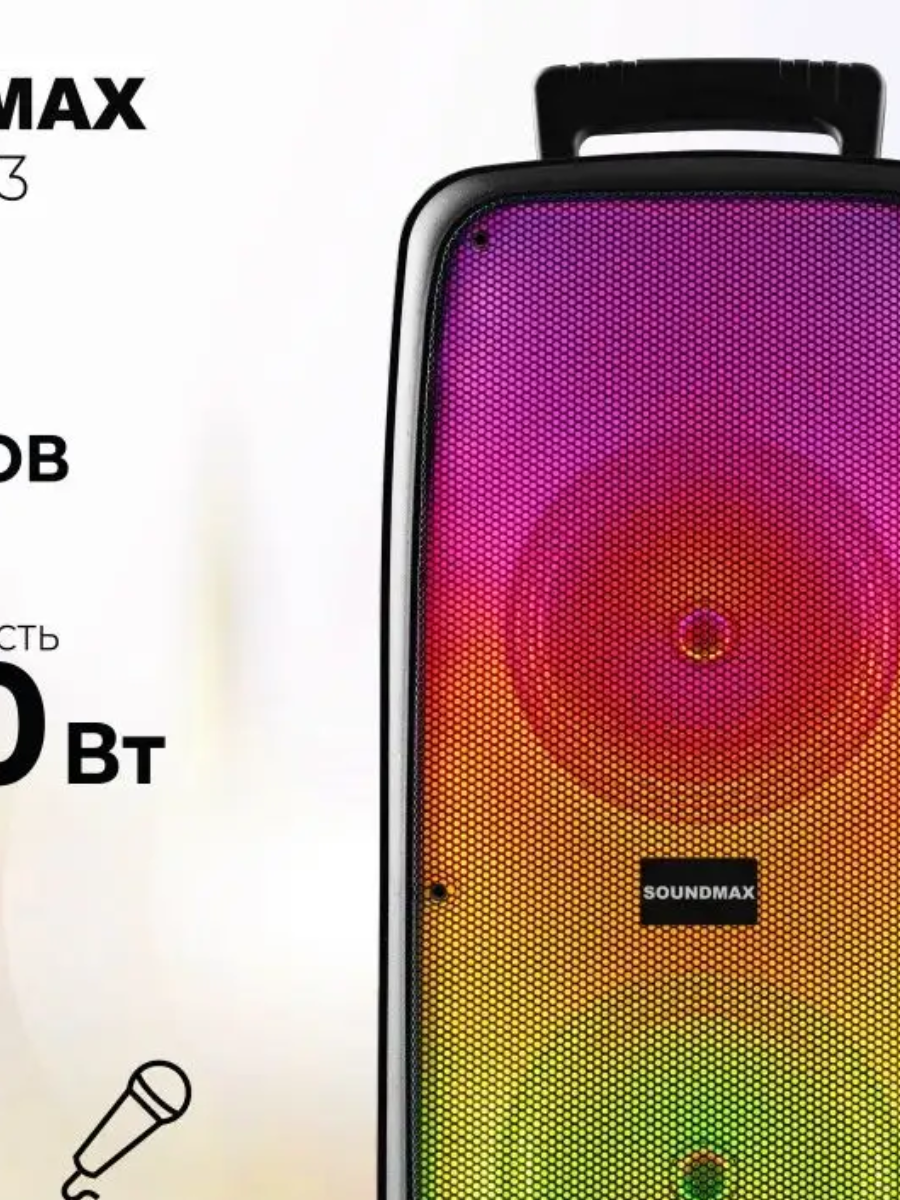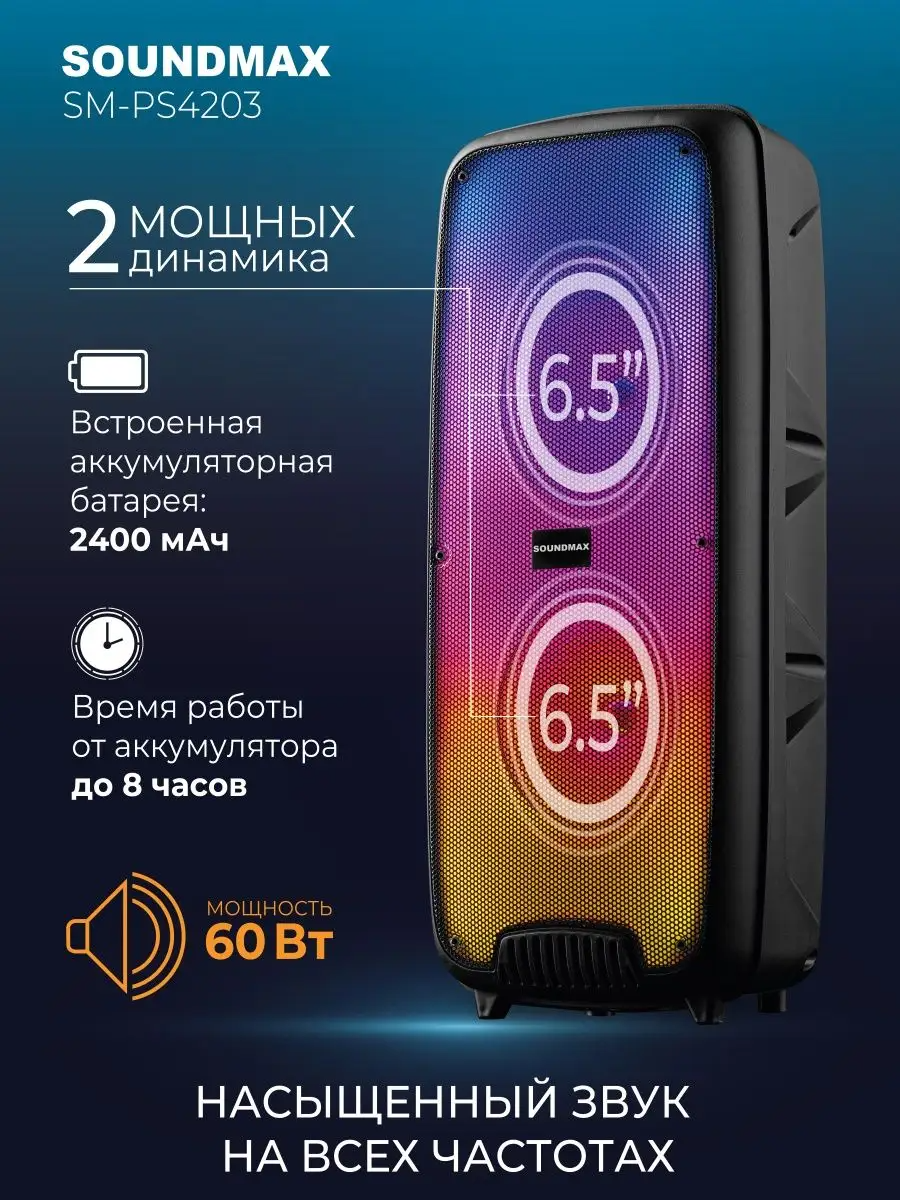 Портативная музыкальная система Soundmax SM-PS4203 позволяет превратить прослушивание музыки в увлекательный и завораживающий процесс. Музыкальный центр выполнен в прочном износостойком корпусе, с удобной ручкой для переноски. Вся информация о работе устройства отображается на ярком LED-дисплее. Устройство оснащено многоцветной LED подсветка с функцией светового шоу. Благодаря выходной мощности 100 Вт и двум мощным динамикам по 6.5, акустическая система формирует детализированный и насыщенный звук с глубоким басом. И все это в автономном режиме - аккумулятор 2400 мАч, способен обеспечивать длительную работоспособность устройства до 8 часов без подзарядки. SM-PS4203 поддерживает Bluetooth 5.0, AUX, USB и TF карты. FM-тюнер порадует прослушиванием любимых радио станций. В особенностях музыкального центра Soundmaх - функция TWS. Для любителей караоке в новинке предусмотрен микрофонный вход 6.35 мм и присутствует функция караоке.