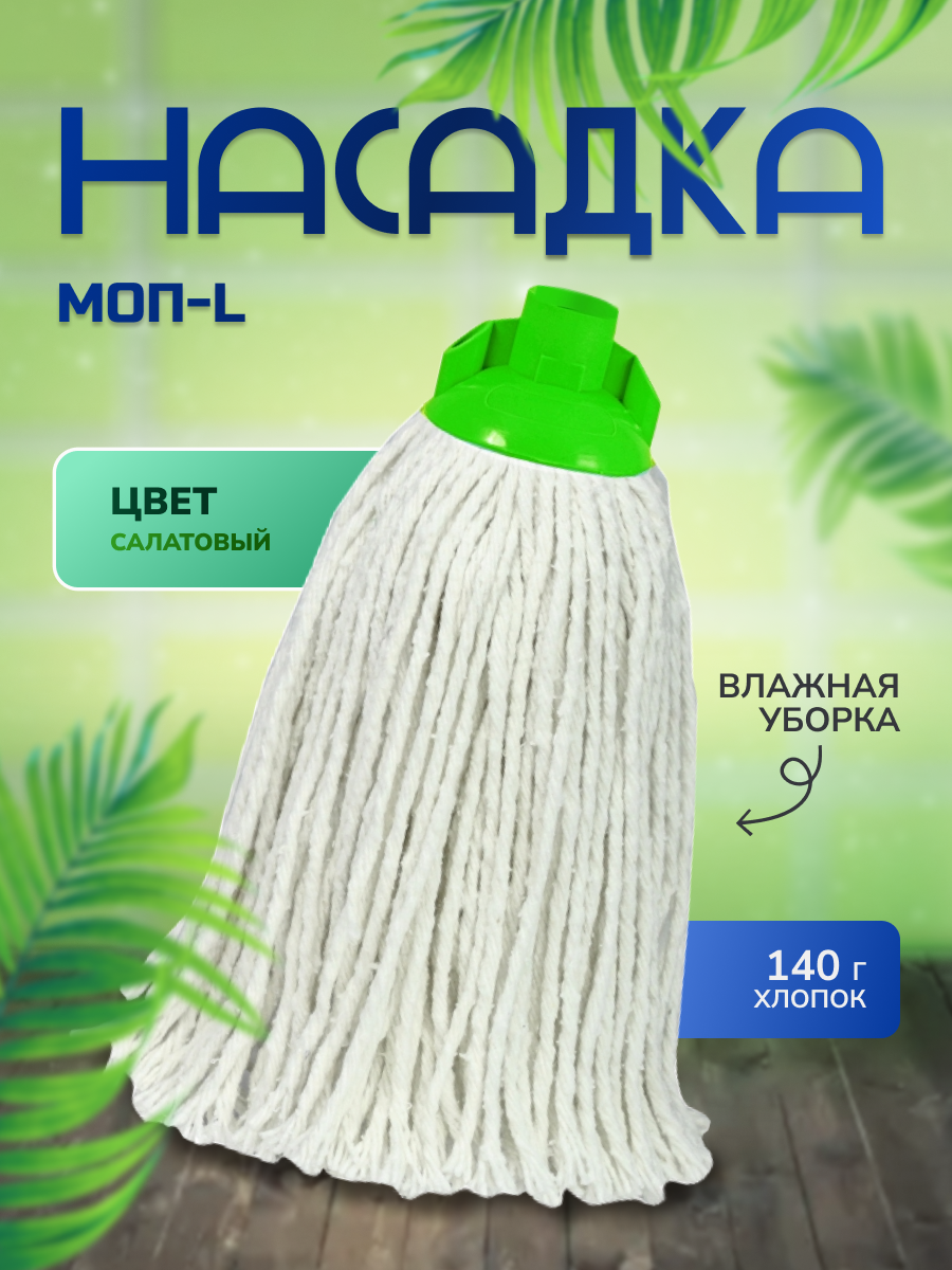 Сменная насадка для швабры МОП. Материал: хлопок - 80% полиэстер - 20%, головка - полипропилен. Подходит для влажной уборки помещений.