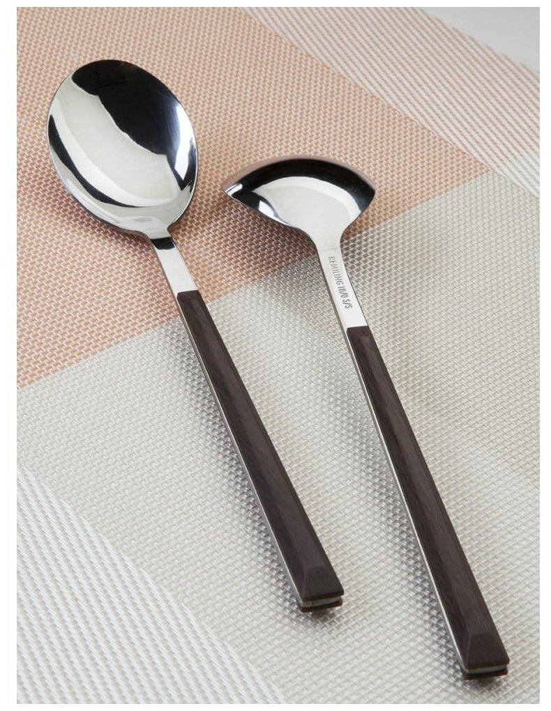Столовые приборы изящной формы с пластиковыми вставками на ручке цвета дерева венге.