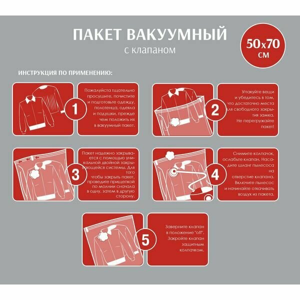 Вакуумный пакет - идеальное решение для компактного хранения вещей: сезонные вещи в межсезонье, редко используемые комплекты одеял и подушек.И даже компактная перевозка вещей во время путешествия.Экономия до 75% объёма. Пакет также защищает вещи от влаги и плесени, выцветания, пыли, запаха и насекомых.Наличие клапана позволяет быстро и легко упаковать вещи. Доступны 2 варианта использования: ручная и с помощью пылесоса.Деликатный принт на пакете добавит игривое настроение в гардеробную.Размер 50х70 см