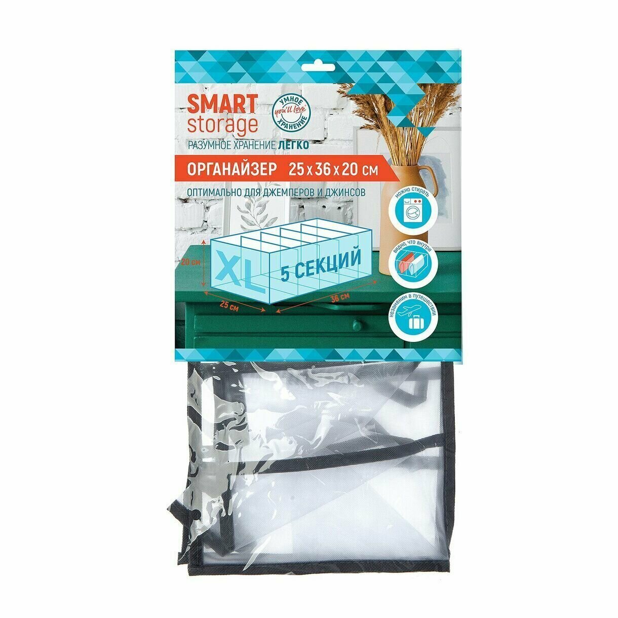 Органайзер из прозрачной нейлоновой сетки, 5 секций. Подойдет для хранения джемперов, джинс. Поможет организовать порядок. Отлично сочетатеся с другими размерами нейлоновых органайзеров Smart Storage.