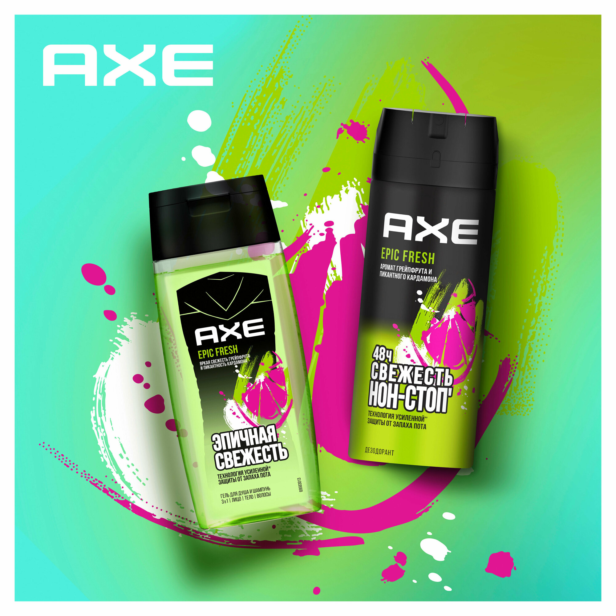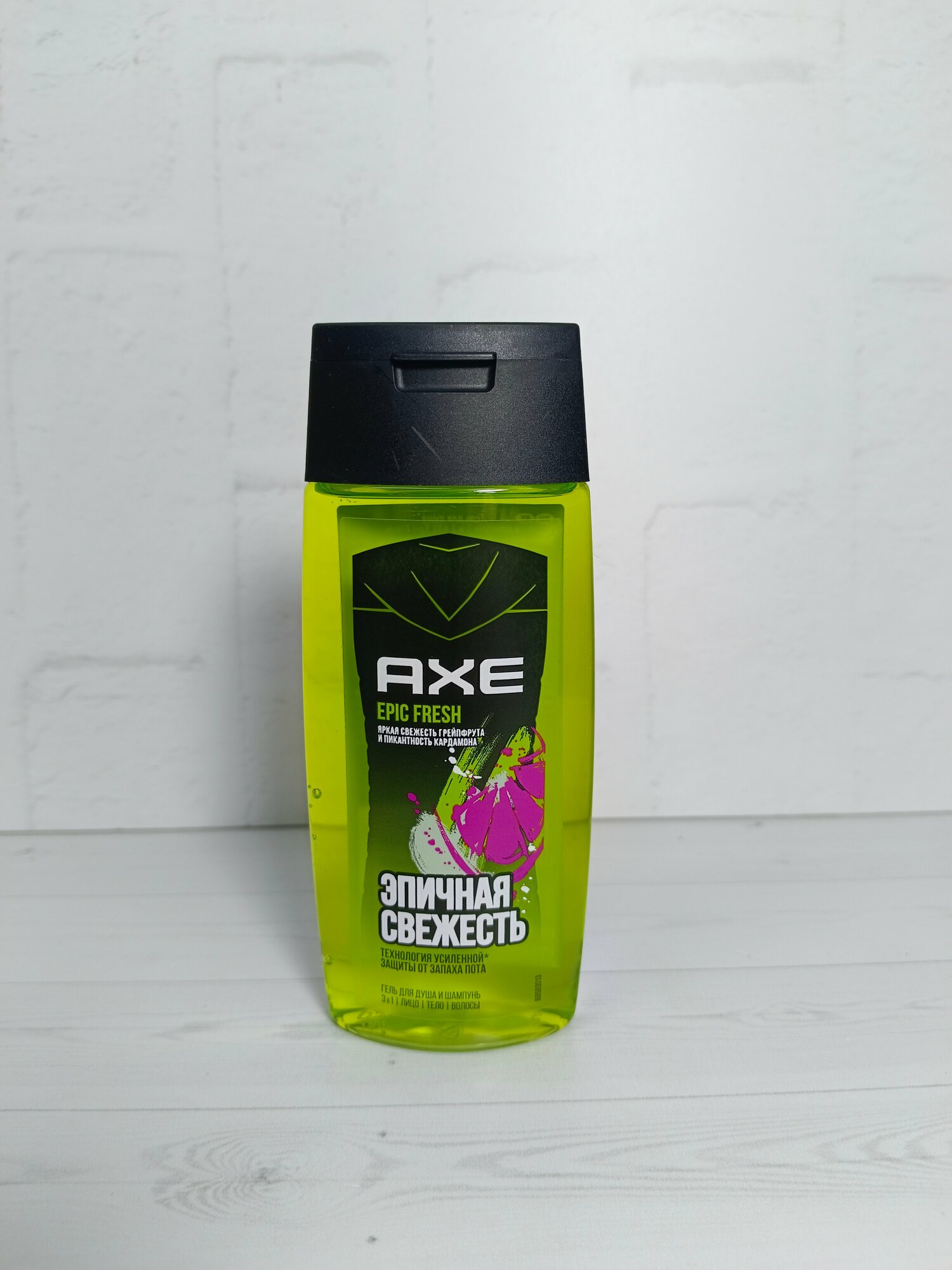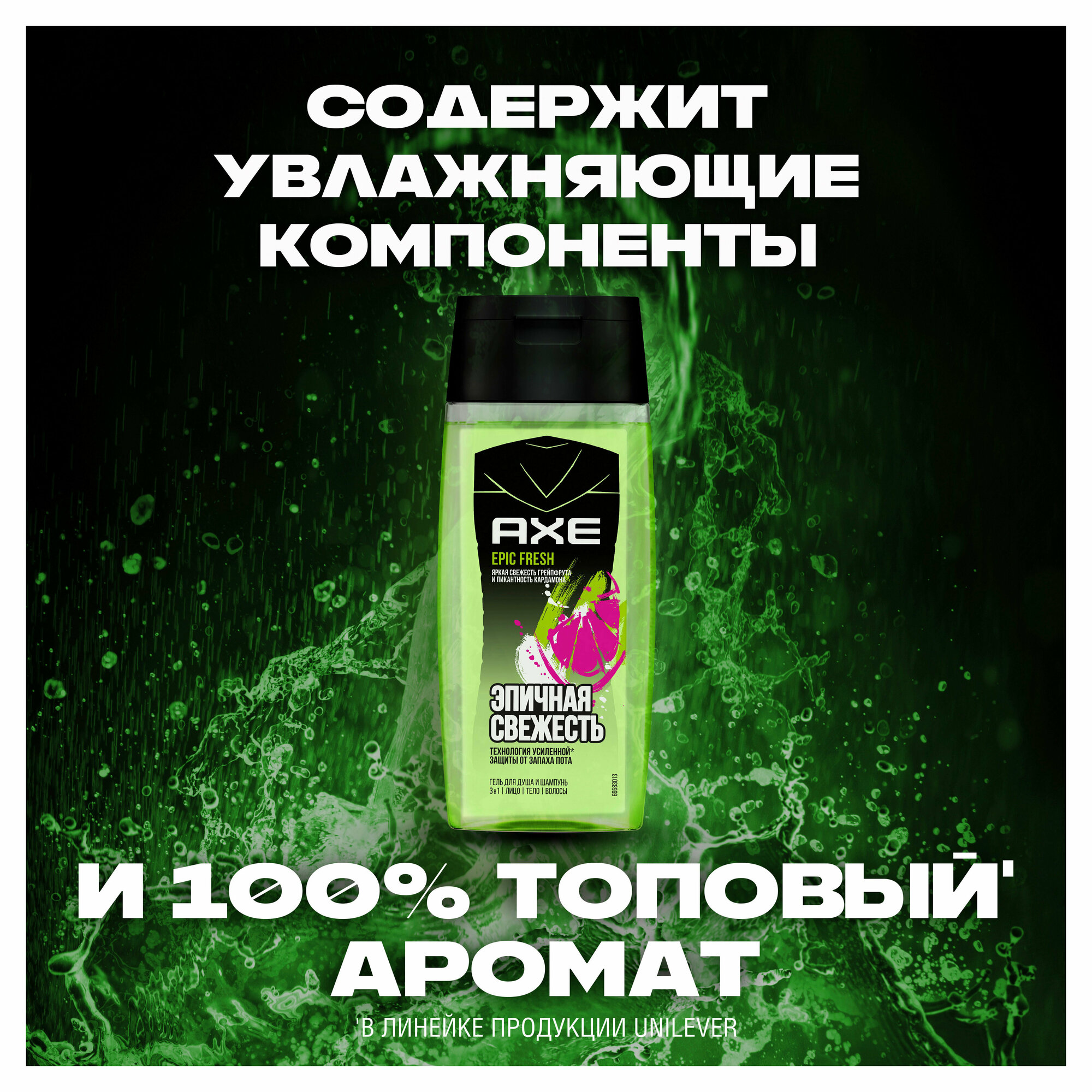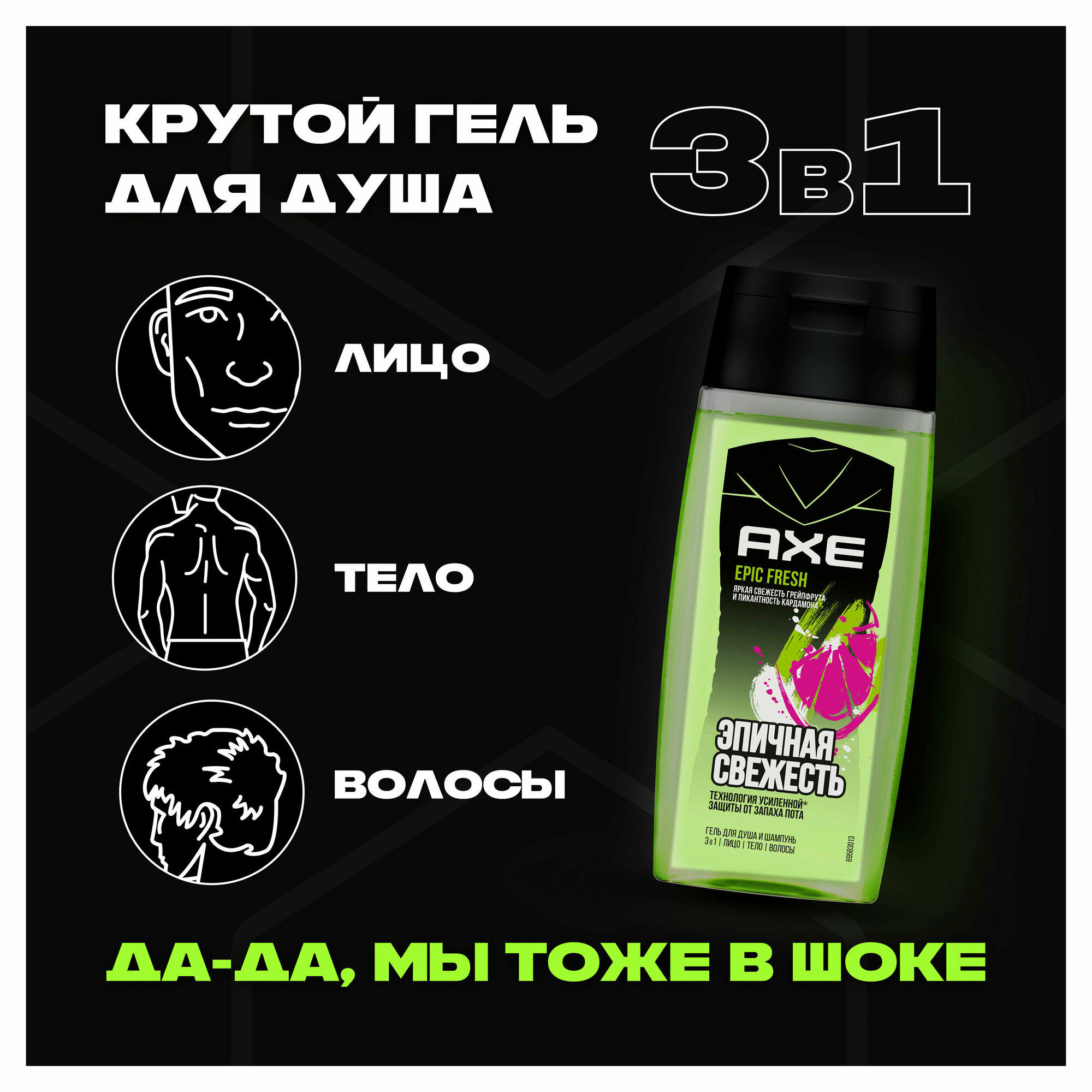 Гель для душа и шампунь 3 в 1 Epic Fresh не содержит парабены, эффективно смывает бактерии, очищает и ухаживает за кожей и волосами пока ты в душе. Отлично подойдет для умывания лица. Все, что нужно для чистой, увлажненной, ухоженной кожи и волос, к которым хочется прикасаться. Крутой аромат с аккордами грейпфрута и нотками кардамона самая долгая свежесть от AXE.