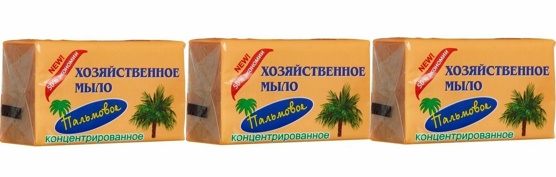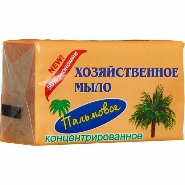Мыло хозяйственное твёрдое Пальмовое представляет собой продукт, состоящий из натриевых солей жирных кислот натуральных масел (кокосового, пальмового, подсолнечного) с добавлением пластификаторов, антиоксидантов и смягчающих веществ. Содержит глицерин. Предназначено для мытья посуды, стирки изделий из различных тканей, а также для санитарно-гигиенических и промышленных целей. Натуральное хозяйственное мыло Пальмовое высококонцентрированное серии Зелёные технологии. Изготовлено из высококачественного сырья. В рецептуре мыла увеличено содержание пальмового масла. Обладает высокой плотностью, что повышает длительность использования. В состав входит глицерин, смягчающий кожу рук. Обладает высокой моющей способностью, мягкой пеной. Отлично отстирывает и отмывает, удобно в использовании для мытья посуды и застирывания белья. Отсутствие ароматизаторов делает это мыло универсальным в использовании при мытье рук, посуды и стирке белья. Не оказывает вредного воздействия на окружающую среду. Не размокает в воде, не трескается при длительном хранении.