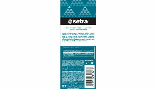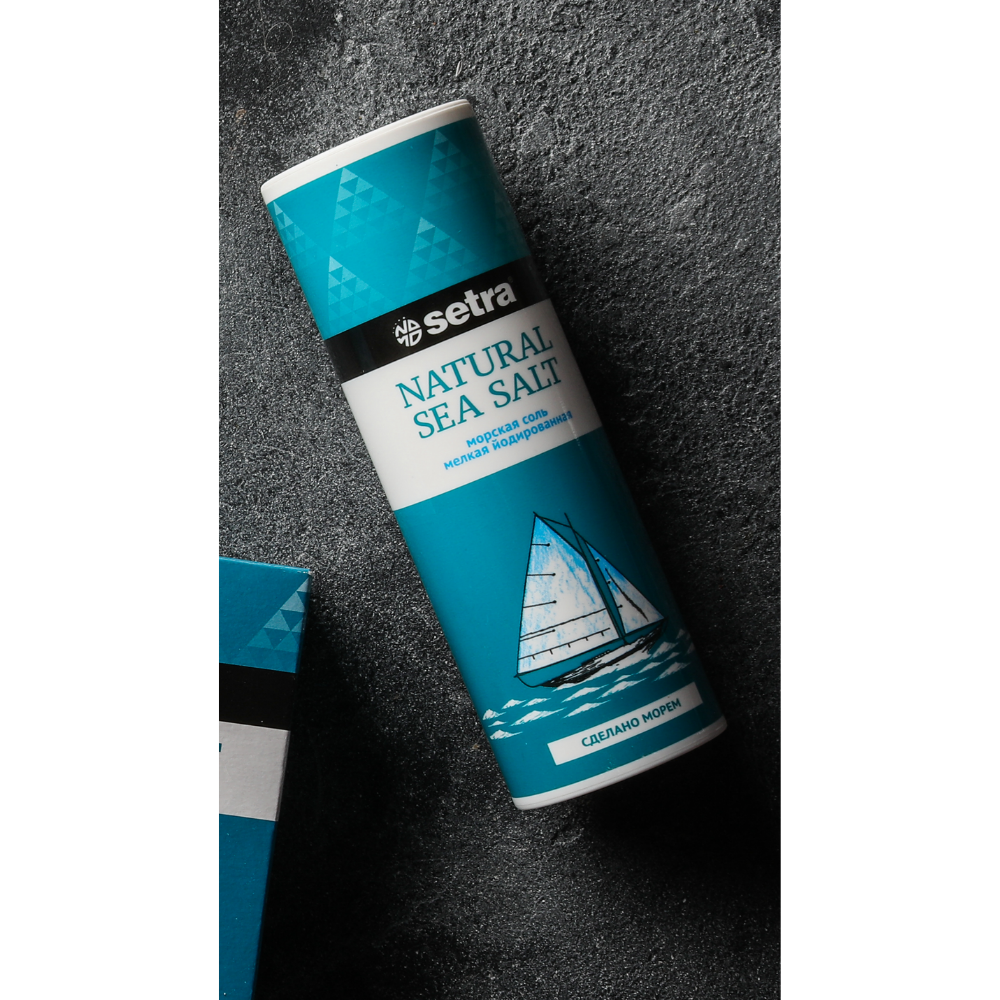 Настоящая морская соль Setra получена, как и сотни лет назад, старым естественным способом выпариванием морской воды на солнце. Такой способ добычи сохраняет первозданную форму и рыхлость кристаллов, полноту минерального состава и аромат моря. Дополнительно обогащенная йодом, эта соль является не только незаменимой приправой к блюдам, но и помогает заботиться о здоровье человека. Помол 0.