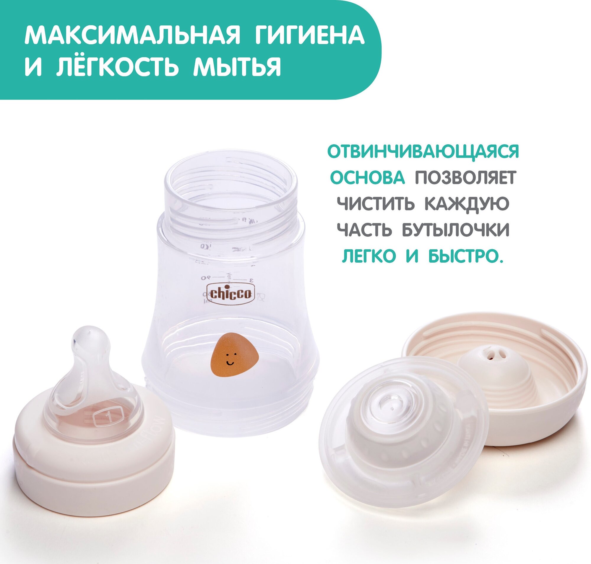 Максимальная гигиена и легкость мытья: Отвинчивающаяся основа позволяет легко и быстро чистить каждую часть бутылочки.