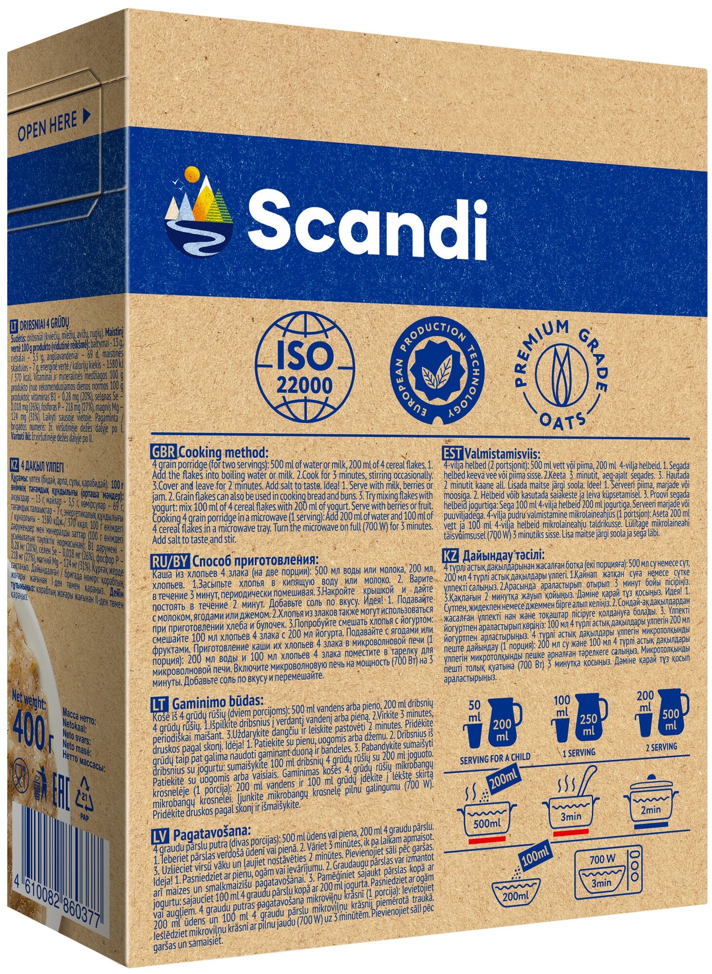 | Состав | Хлопья пшеничные, хлопья ячменные, хлопья овсяные, хлопья ржаные. |