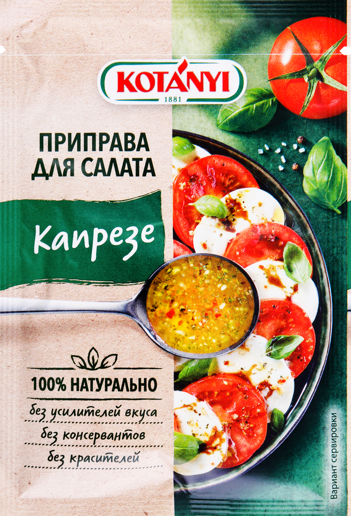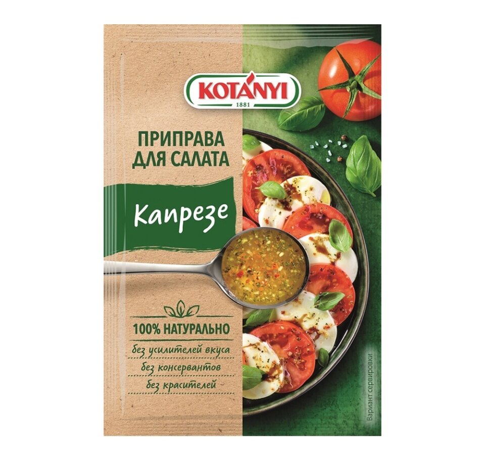 Всемирно известный итальянский салат теперь можно приготовить у вас дома! Томаты, моцарелла, оливковое масло и, конечно же, оригинальная заправка. Все необходимые специи для заправки в пакетике KOTANYI.
