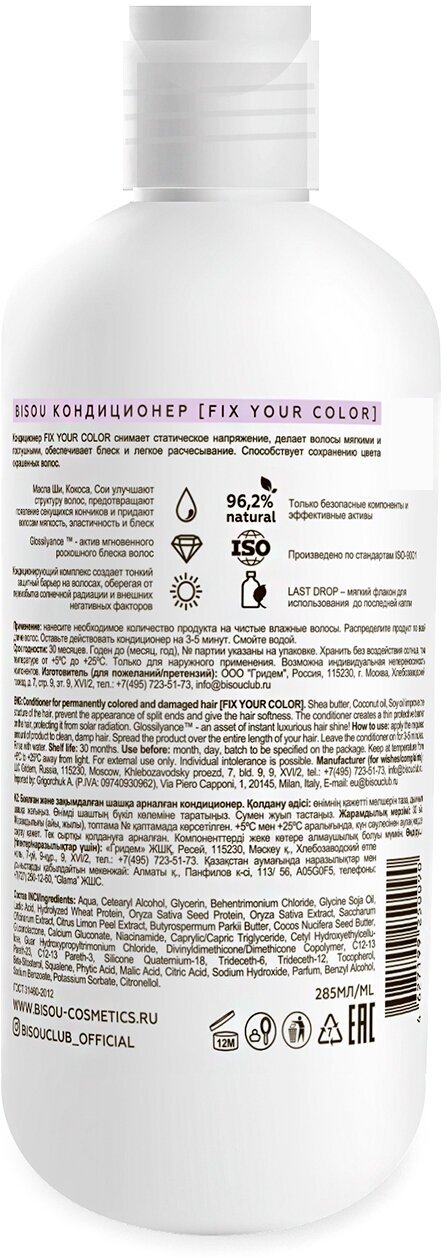 Кондиционер FIX YOUR COLOR снимает статическое напряжение, делает волосы мягкими и послушными, обеспечивает блеск и легкое расчесывание. Способствует сохранению цвета окрашенных волос. Масла Ши, Кокоса, Сои улучшают структуру волос, предотвращают появление секущихся кончиков и придают волосам мягкость, эластичность и блеск. Кондиционирующий комплекс создает тонкий защитный барьер на волосах, оберегая от переизбытка солнечной радиации и внешних негативных факторов. Glossilyance - актив мгновенного роскошного блеска волос! LAST DROP мягкий флакон для использования до последней капли. 96,2% natural. Только безопасные составы и эффективные активы. Разработано и произведено по стандартам ISO 9001.