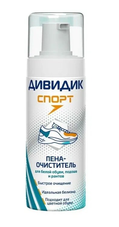 Пена очиститель для белой и цветной обуви Дивидик Спорт - средство для очистки загрязнений на белой или цветной обуви. Пенка для обуви чистит белые и разноцветные: туфли, кроссовки, кеды, мокасины, балетки, слипоны, лоферы, сапоги, ботинки, полуботинки, сникеры, тимберленды и другую обувь разных цветов с белой подошвой, рантами, цветными вставками и без, из замши, кожи, нубука, спилка, синтетический кожи, экокожи, кожзама, текстиля и других материалов. Чистящая пена для обуви так же эффективно убирает грязь с сумки, перчаток, рюкзака, верхней одежды, брюк, аксессуаров и других изделий из кожи, комбинированной ткани и других материалов. Средство обновит цвет, сделает его ярче, обеспечит идеальную белизну. Активная пена продлевает срок службы изделий, восстанавливает внешний вид и изначальный цвет. Пена очиститель бесцветная помогает вернуть любимой обуви первозданную чистоту.