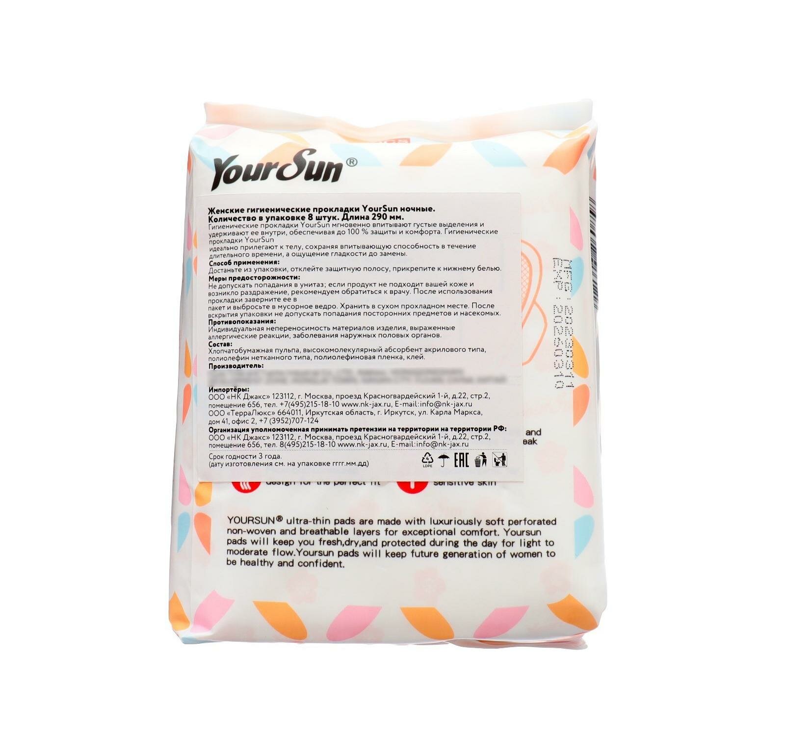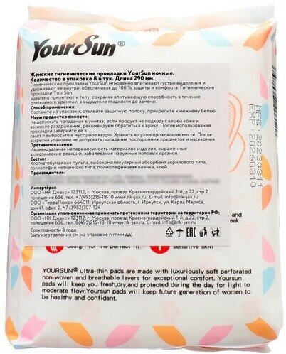 | Полное наименование | Женские гигиенические прокладки с крылышками YourSun Super, 29 см 8 шт |