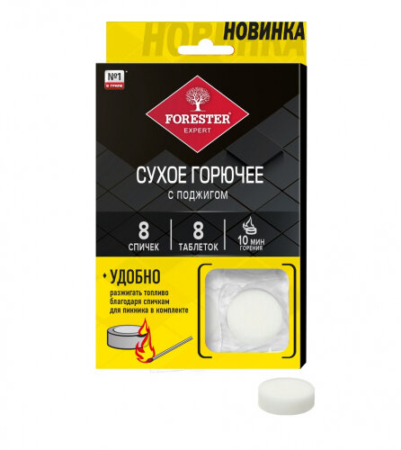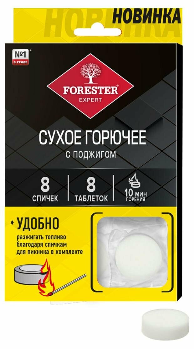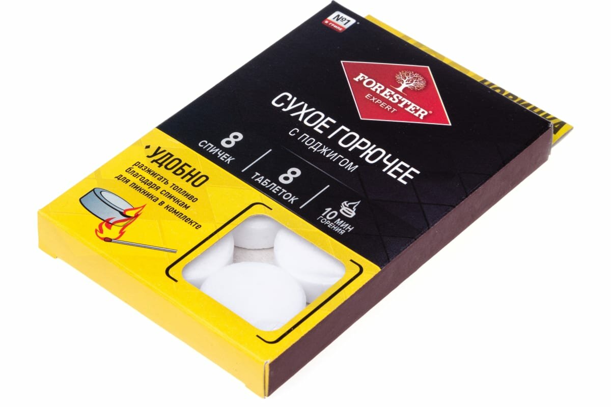 Forester Сухое горючее с поджигом предназначено для разведения огня, розжига угля, брикетов, дров. Можно использовать в каминах, печах, мангалах. Сухое горючее в форме таблетки горит спокойным ровным пламенем,не вспыхивая. Не коптит. Не оставляет золы. Время горения одной таблетки не менее 10 минут. Состав набора: сухое горючее -8 таблеток, спички для пикника -8 шт.