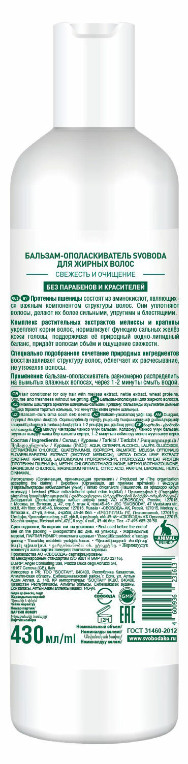 Сервис сравнения цен СкидкаГИД предлагает сравнить цены на товар «Бальзам-ополаскиватель для волос Свобода Свежесть и очищение для жирных волос 430 мл»